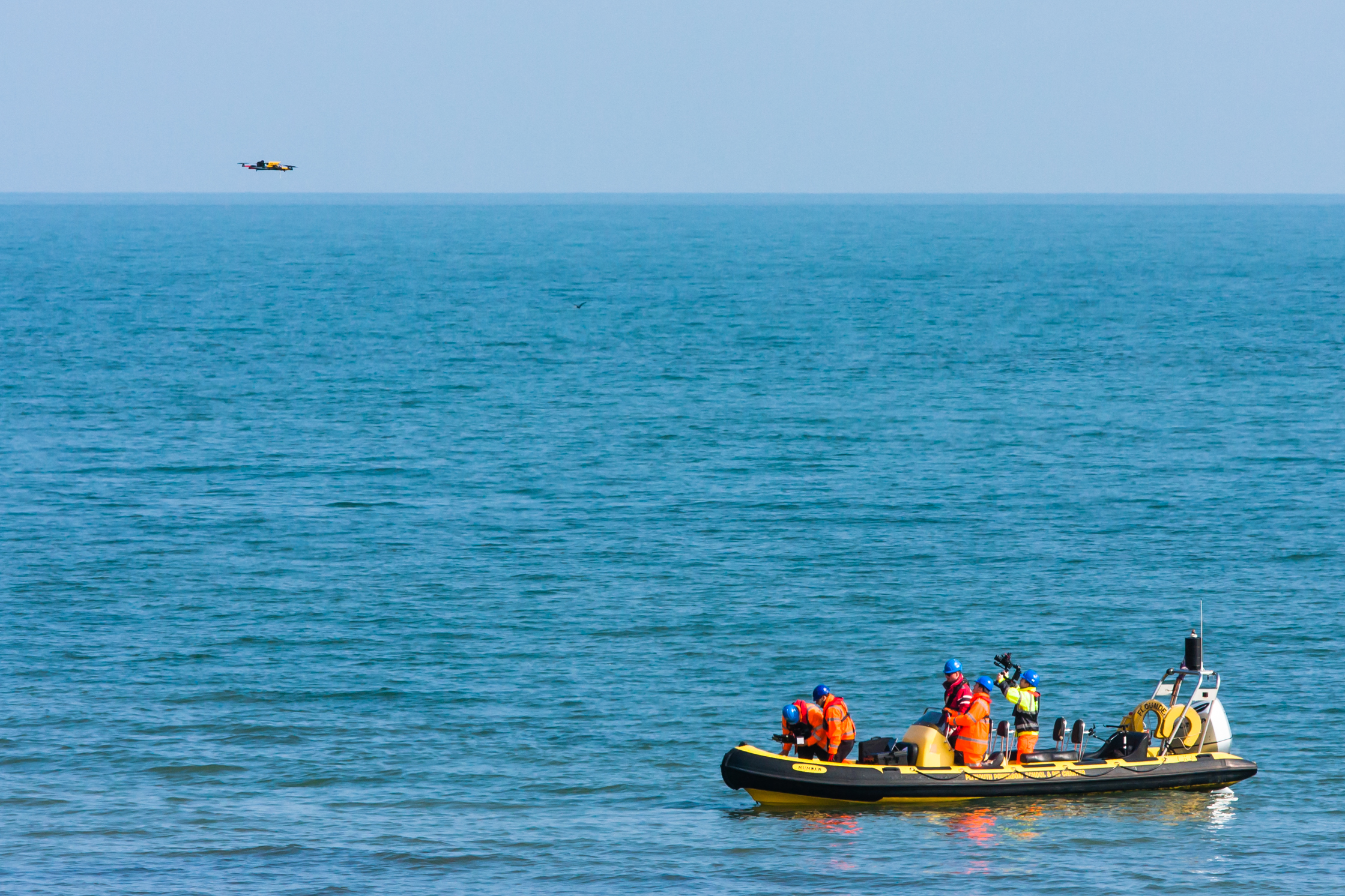 Unmanned Aerial Vehicle (UAV) being launched from a Rigid Inflatable Boat (RIB) at Teignmouth as part of a geological survey to improve the resilience of the railway between Exeter and Newton Abbot