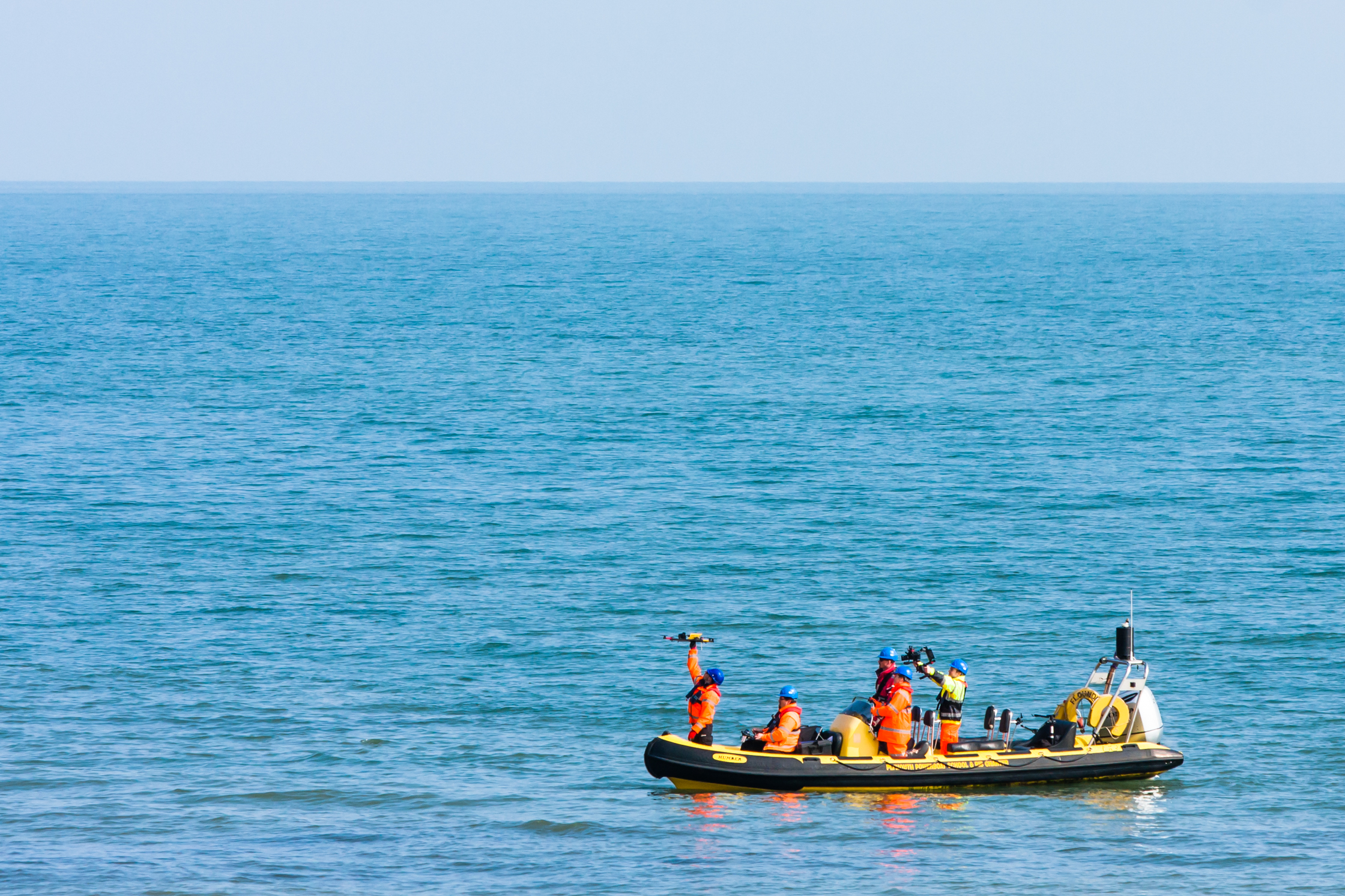 Unmanned Aerial Vehicle (UAV) being launched from a Rigid Inflatable Boat (RIB) at Teignmouth as part of a geological survey to improve the resilience of the railway between Exeter and Newton Abbot