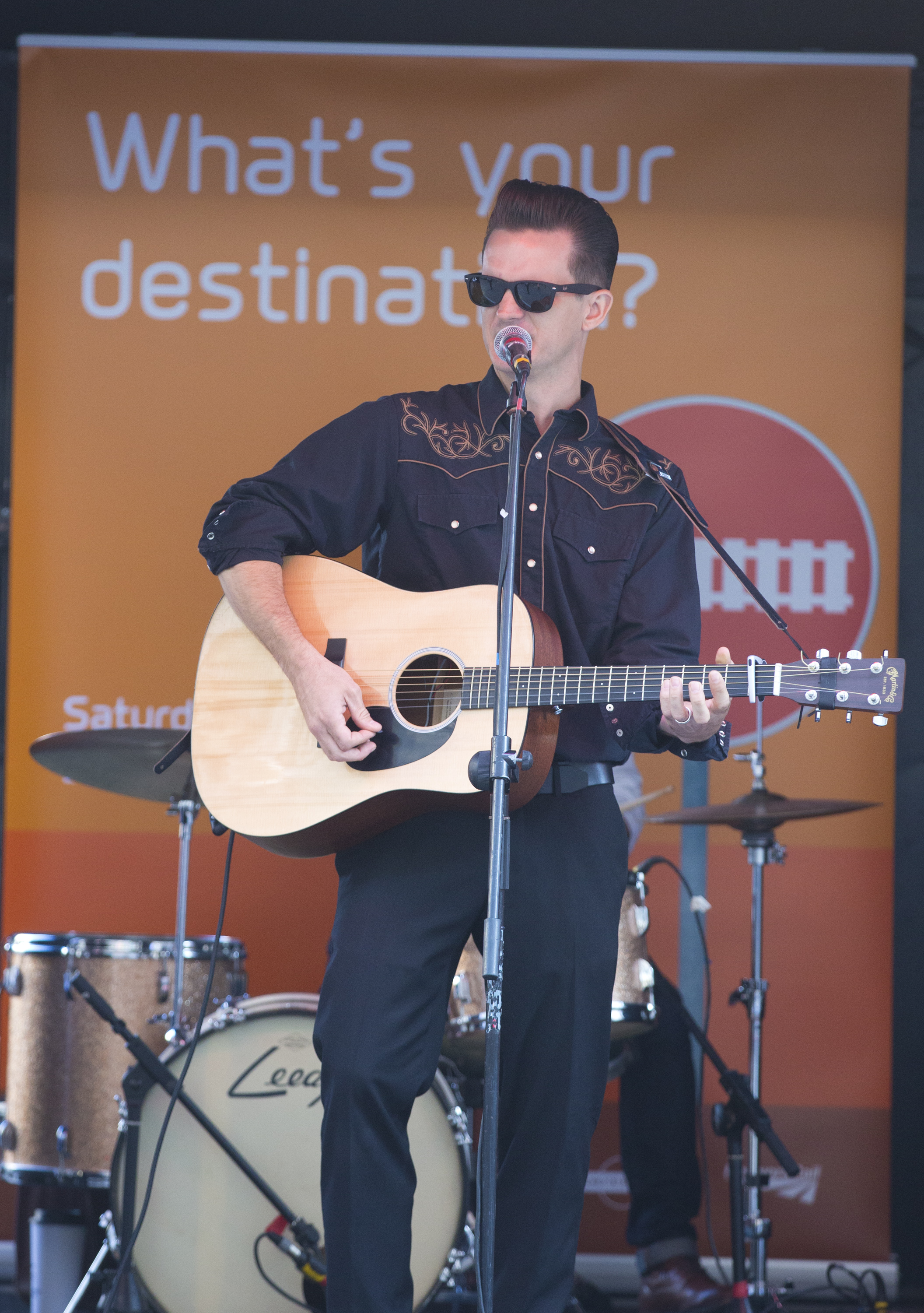 The Johnny Cash tribute act - Cash Band London - perform in front of a Thameslink Programme banner