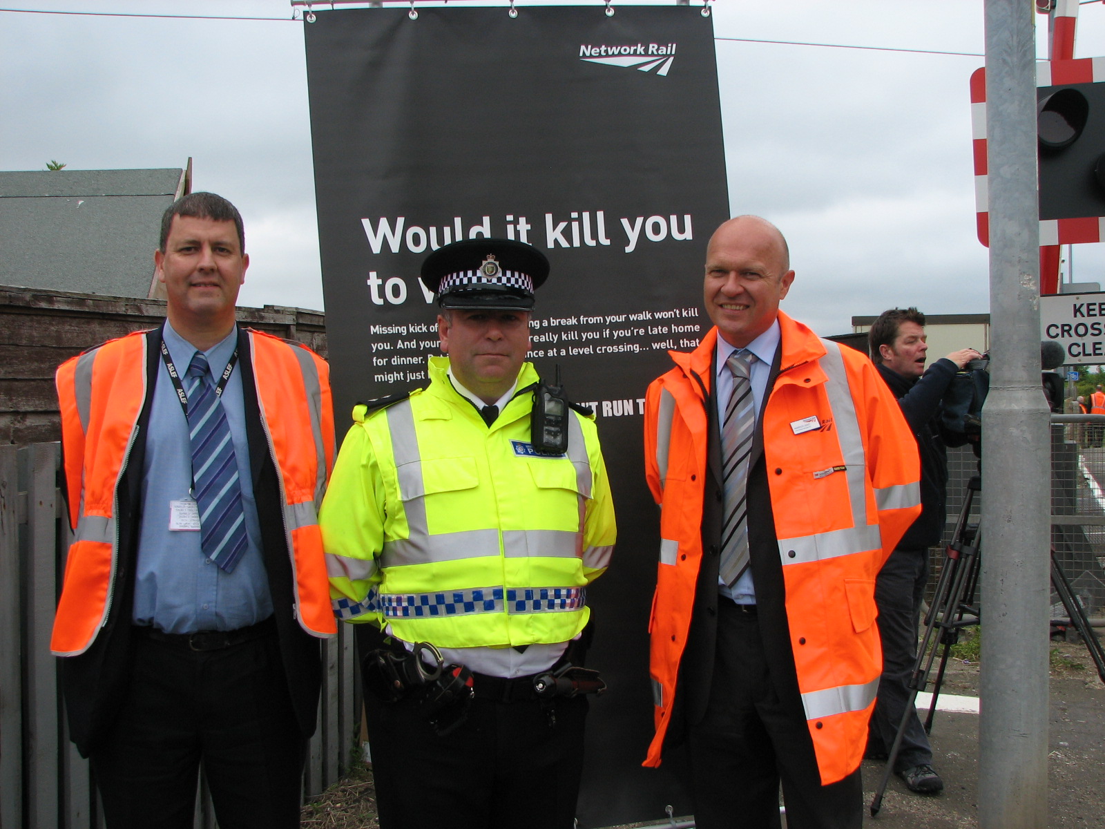 25 June 2009 L-R Dave Healy, Northern Rail train driver, Inspector Ezra Keen from BTP and Warrick Dent, Network Rail Area General Manager