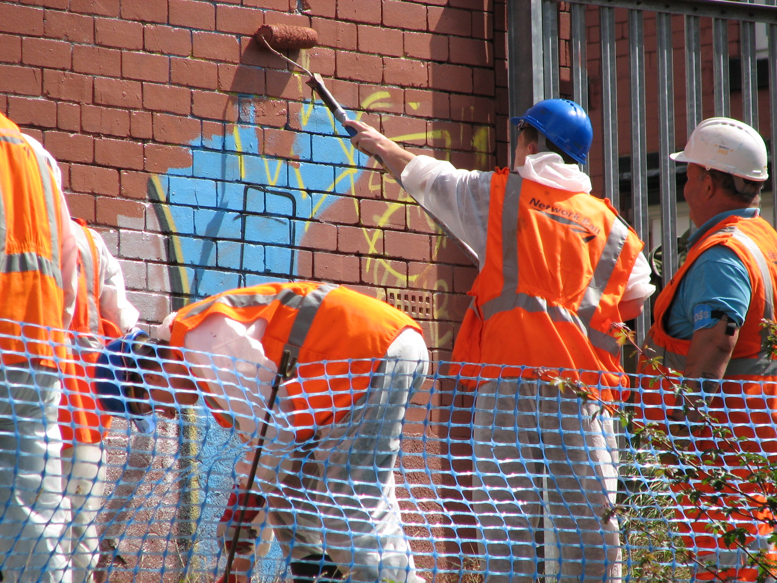 Young people who have comitted offences in Leeds remove graffiti at Burley Park station as part of their reparation work. In partnership with Network Rail