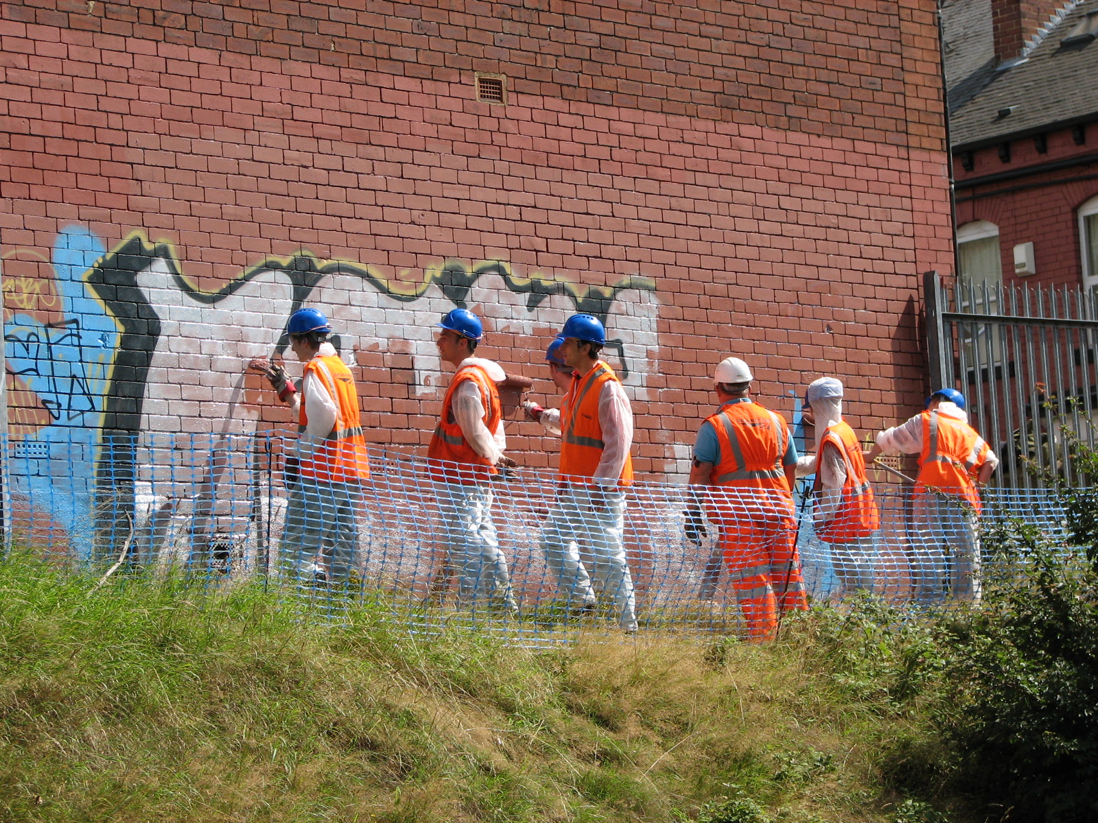 Young people who have comitted offences in Leeds remove graffiti at Burley Park station as part of their reparation work. In partnership with Network Rail