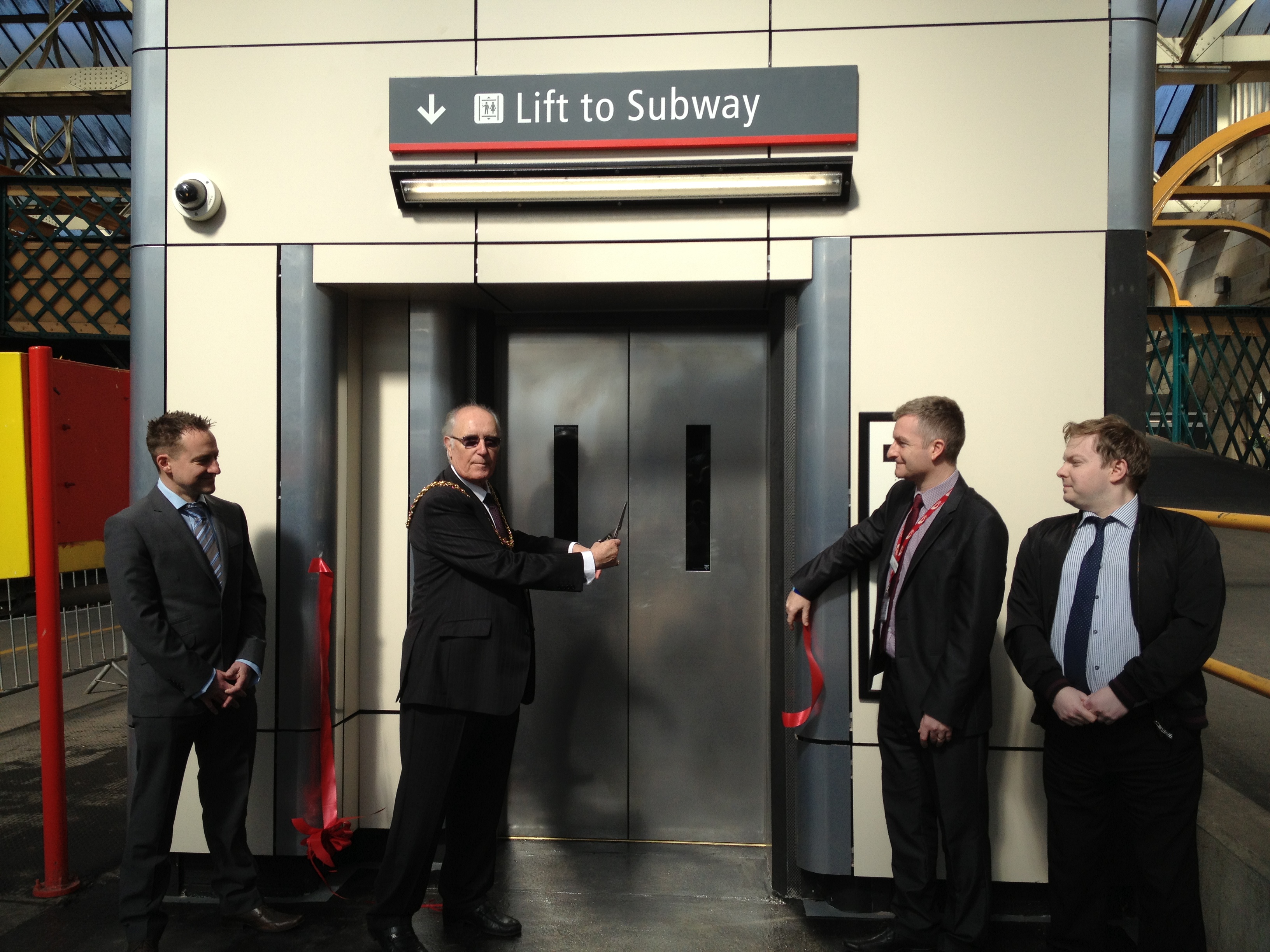 Darren Miller, Network Rail, Councillor Ray Bloxham, Major of Carlisle, Mark Green, Virgin Trains and David Gale of Trailblazers formally open the new facilities at Carlisle station