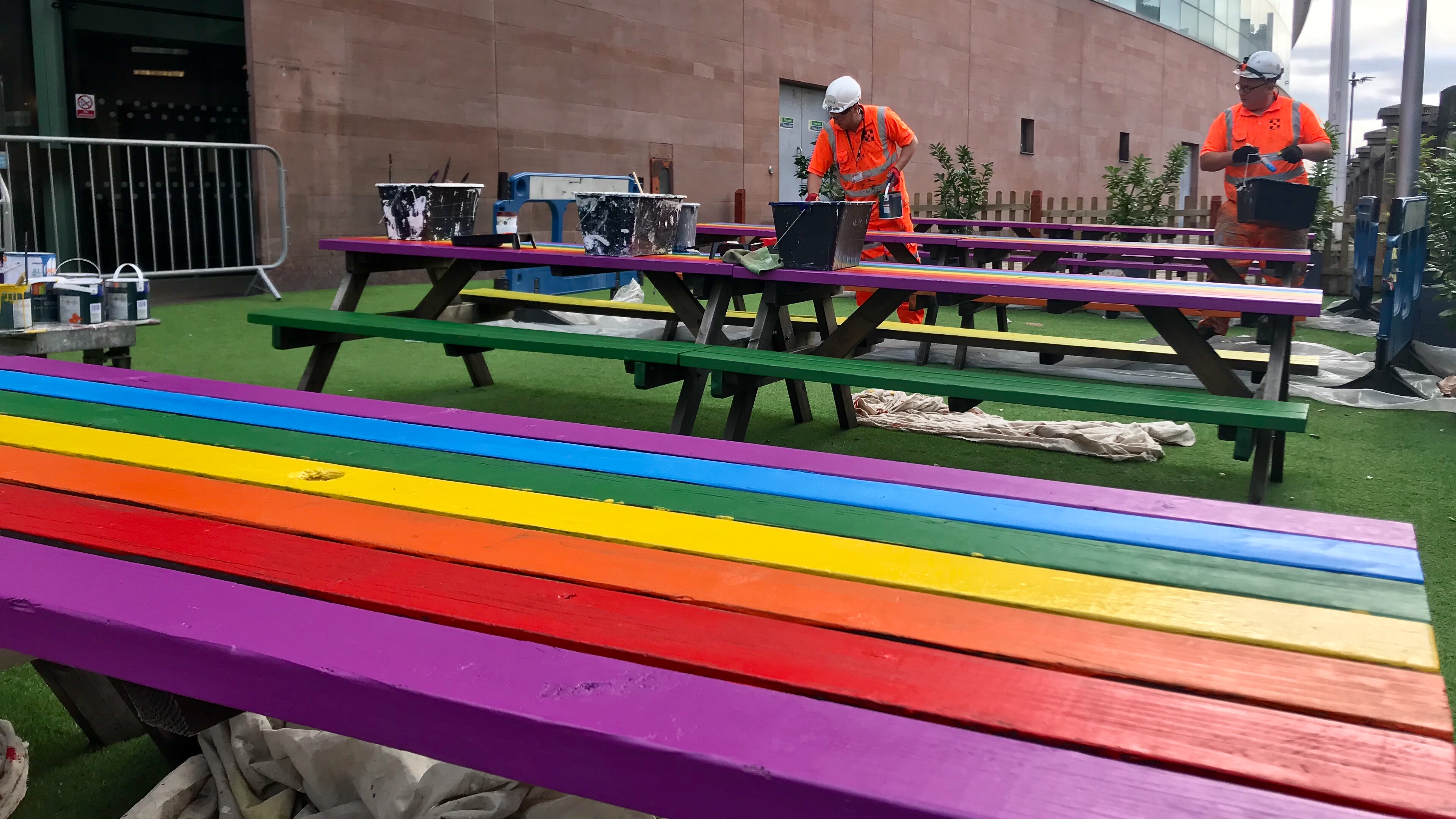 Network Rail workers painting the benches for Manchester Pride