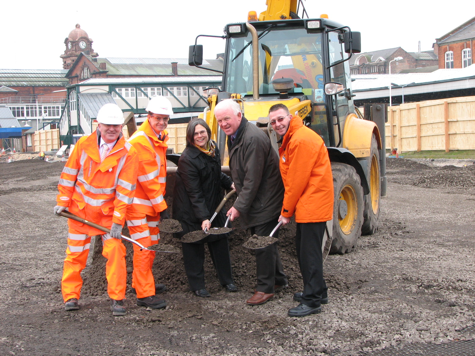 Left to right Gary Thomasson, VINCI Construction UK Limited; Martin Frobisher, route director at Network Rail; Councillor Jane Urquhart portfolio holder for transport and area working at Nottingham City Council; John Watson chair of the Hub project board; and Paul Hanley station managet at Nottingham for East Midlands Trains