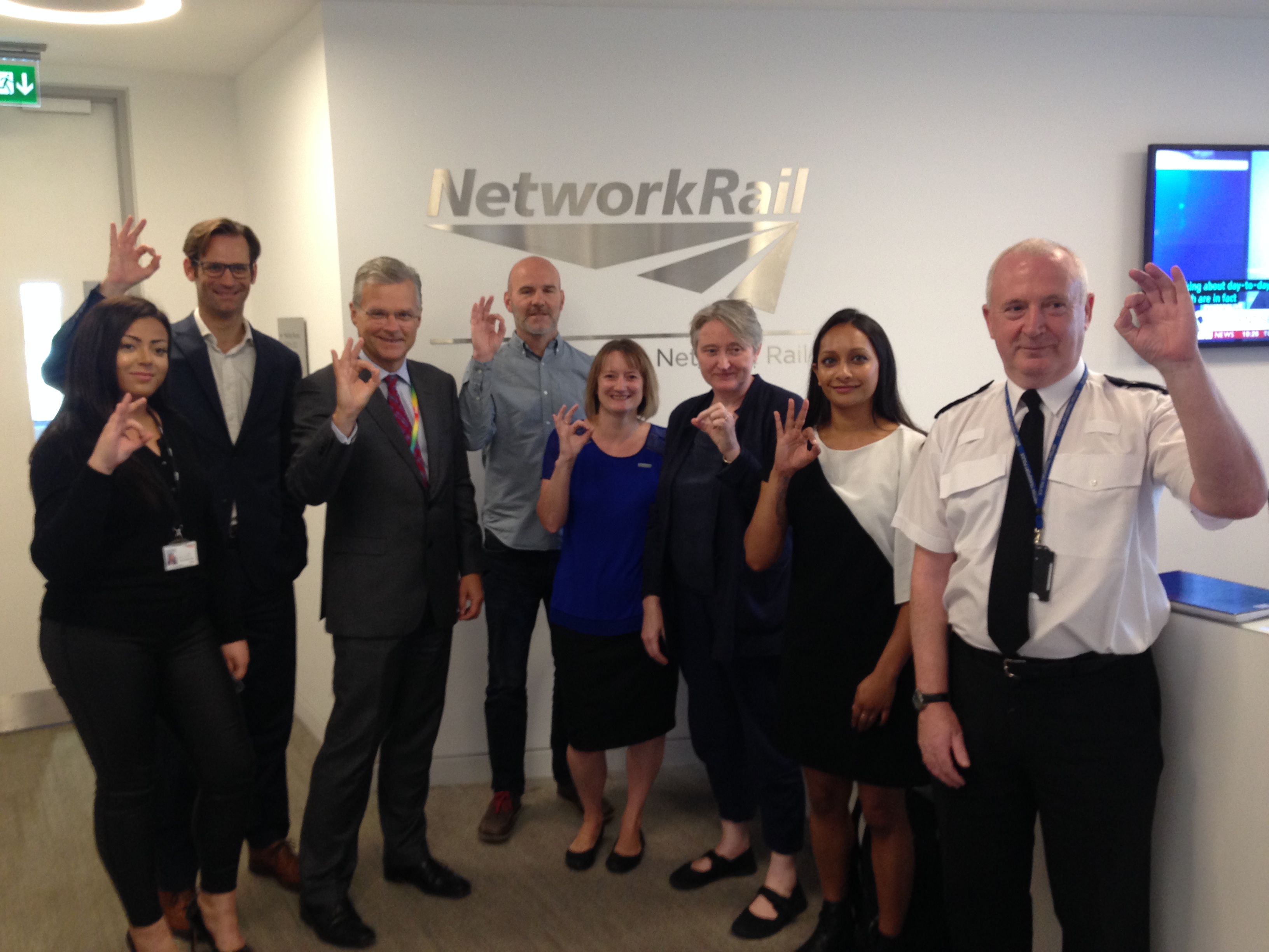 Organisations spearheading suicide prevention met at Network Rail’s London Euston headquarters to challenge the taboo that exists, particularly amongst men, of talking about suicide. From left to right; Neena Naylor – train dispatcher, Network Rail; Jonathon Marron – director of mental health, Department for Health; Mark Carne – chief executive, Network Rail, and deputy chair of the Rail Delivery Group (RDG); Brian Dow – director of Rethink Mental Illness, and co-chair of National Suicide Prevention Alliance (NSPA); Jacqui Morrissey – head of external affairs, Samaritans and co-chair of National Suicide Prevention Alliance (NSPA); Jane Powell – chief executive officer, Campaign Against Living Miserably (CALM); Poona Bell – executive editor, Huffington Post; Ken Young, chief inspector, British Transport Police