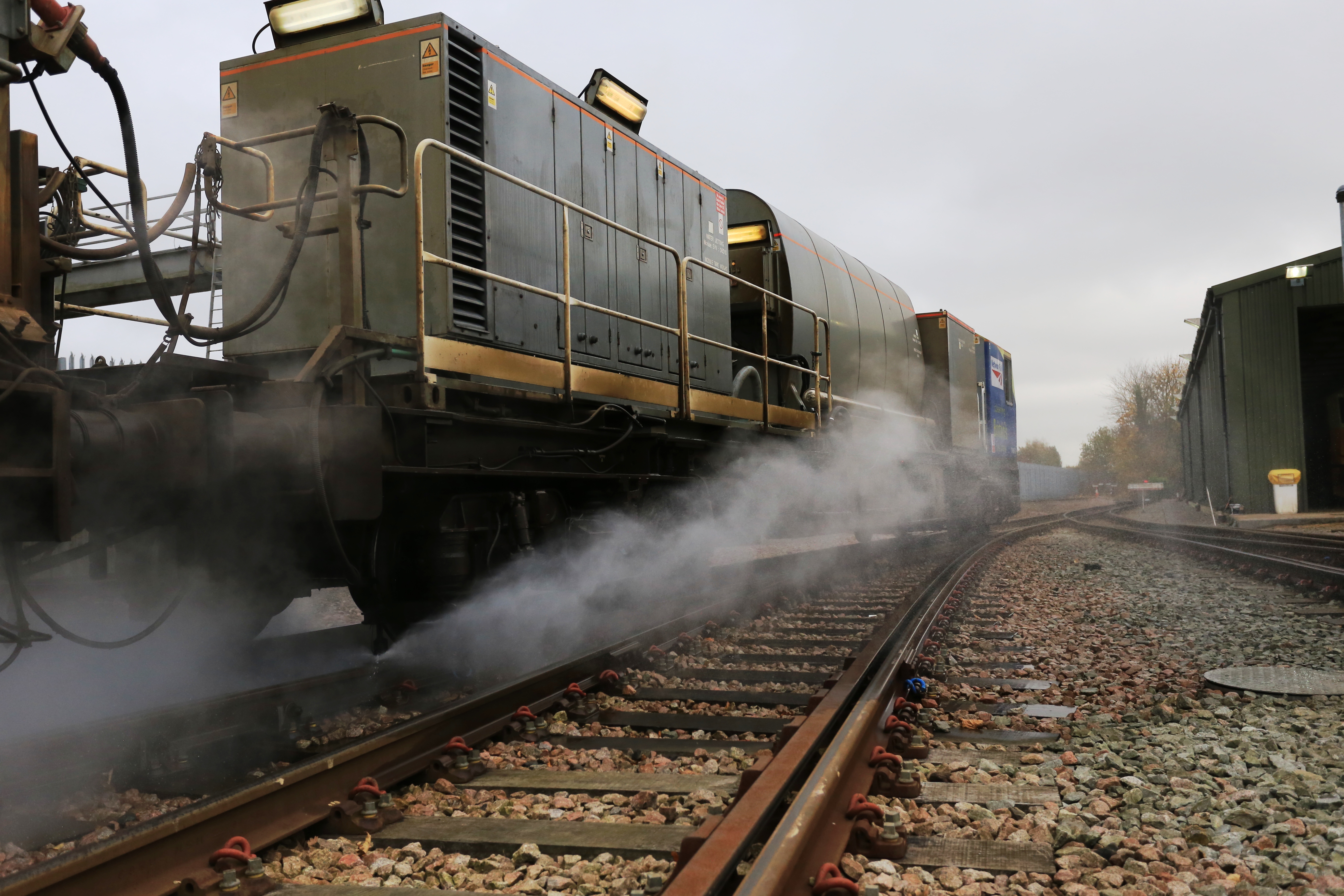 One of our fleet of treatment trains that clean the rails using water jets and then apply a sand-based gel to help trains gain traction http://www.networkrail.co.uk/timetables-and-travel/delays-explained/leaves/ RHTT; Rail Head Treatment Train; Autumn; Winter; Weather