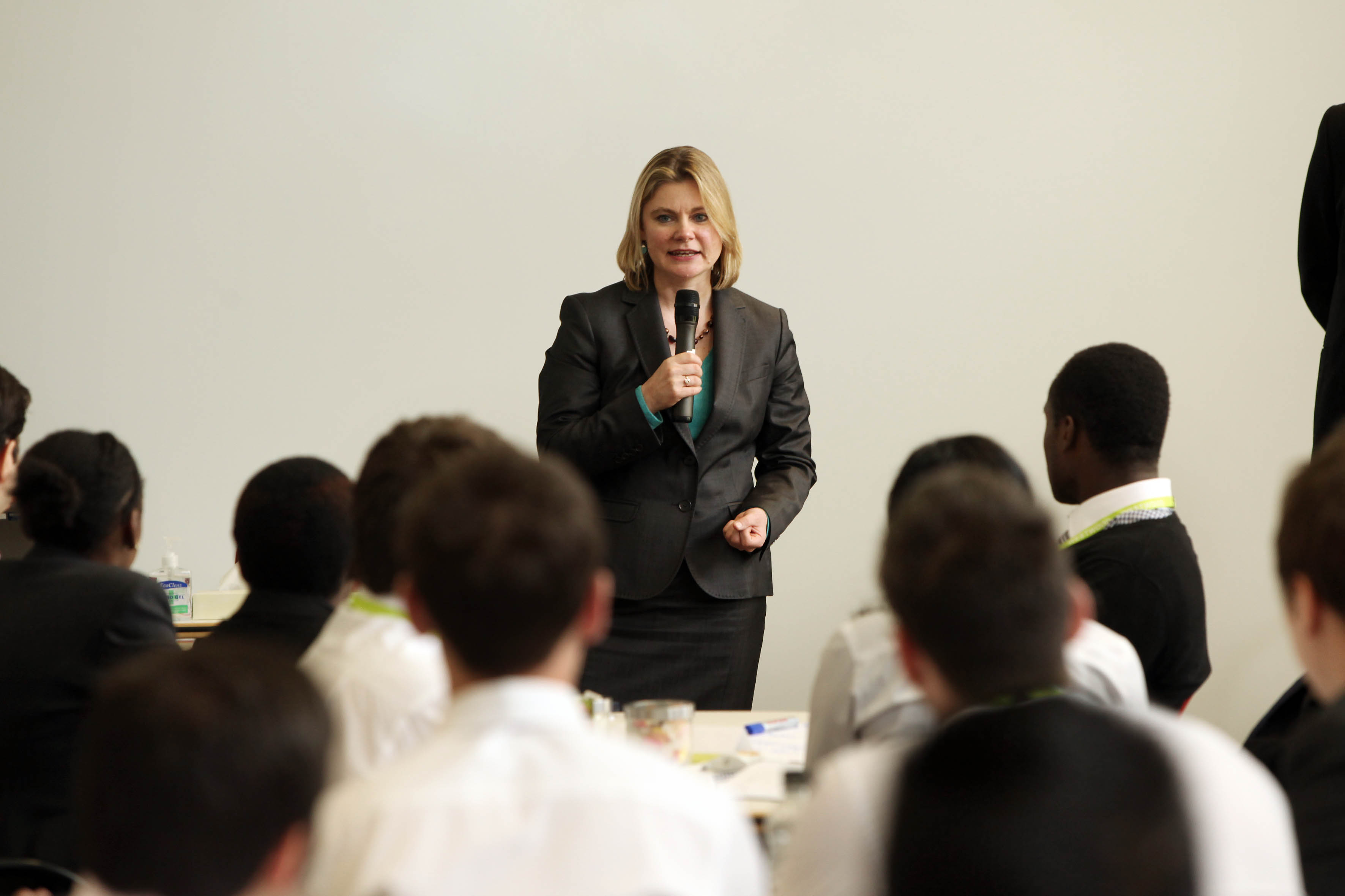 Transport Secretary Justine Greening talks to interns at visit to Track and Train rail industry scheme induction