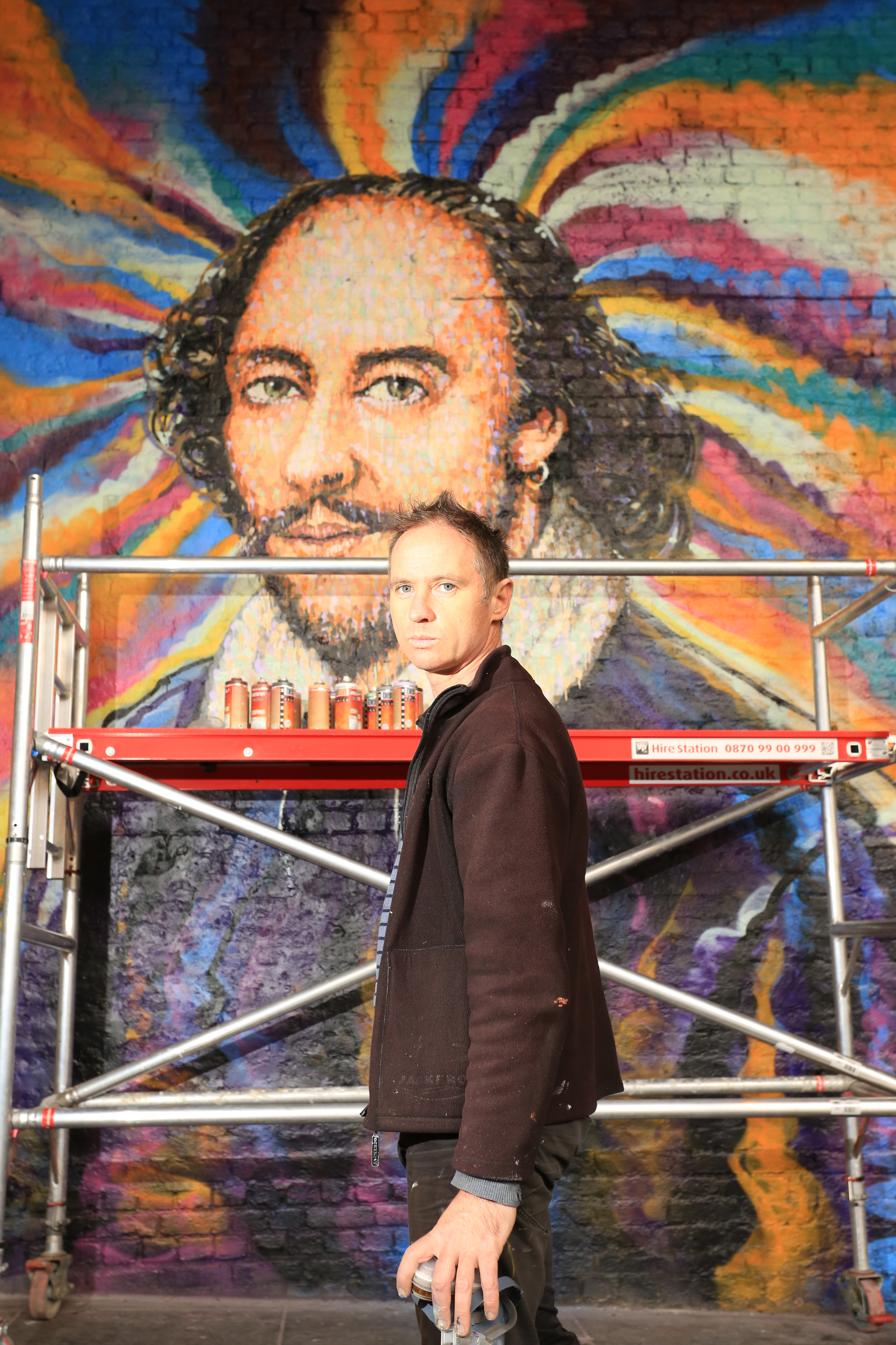 Street artist Jimmy C works on a portrait of William Shakespeare on a Network Rail wall in Southwark