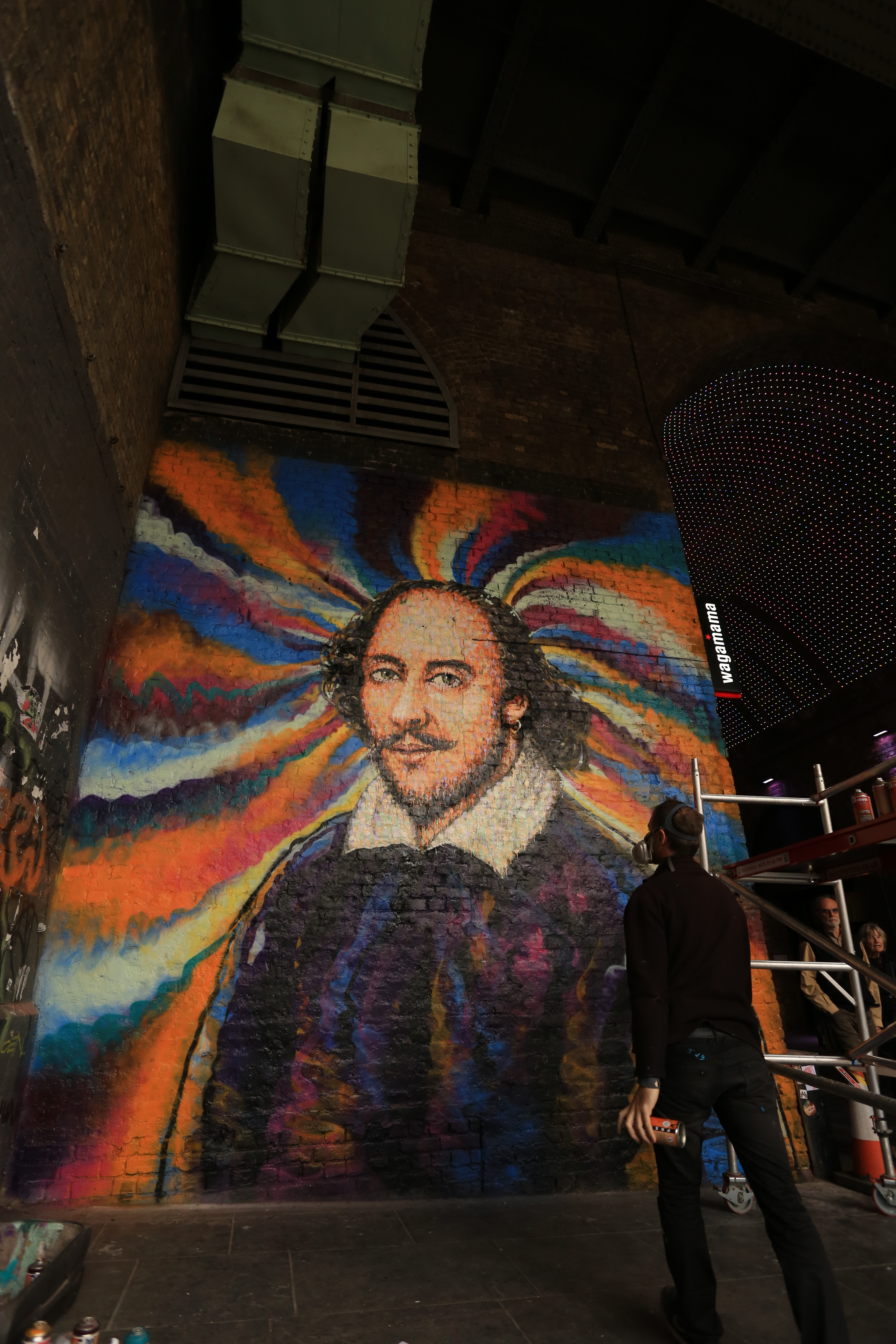 Street artist Jimmy C works on a portrait of William Shakespeare on a Network Rail wall in Southwark
