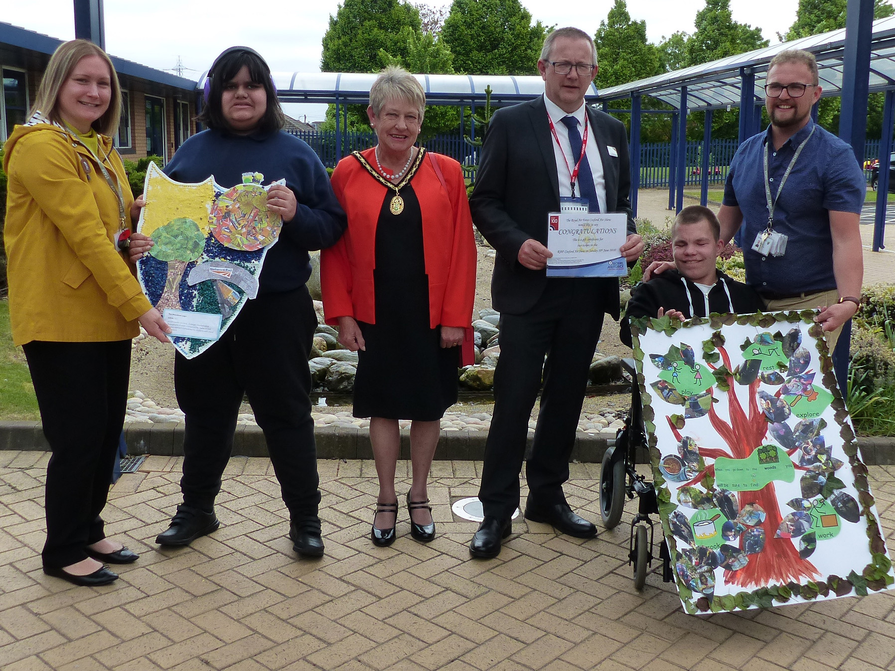 L-R Presentation of prizes. Sarah Lockitt - teacher, Joshua, Susan Eaves - Deputy Mayor of Sandwell, Allun Edge - Network Rail, Bradley, Kevin Hurcombe – class teacher