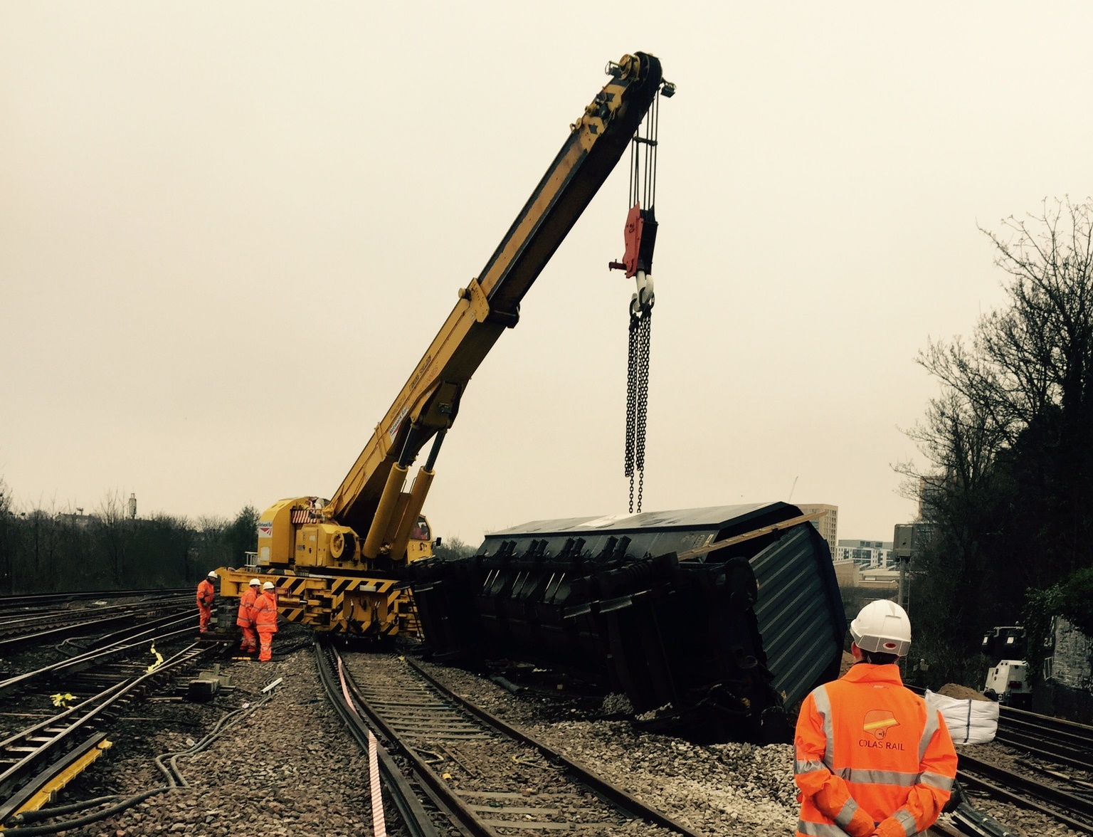 Lewisham derailment - crane lifts final wagon upright
