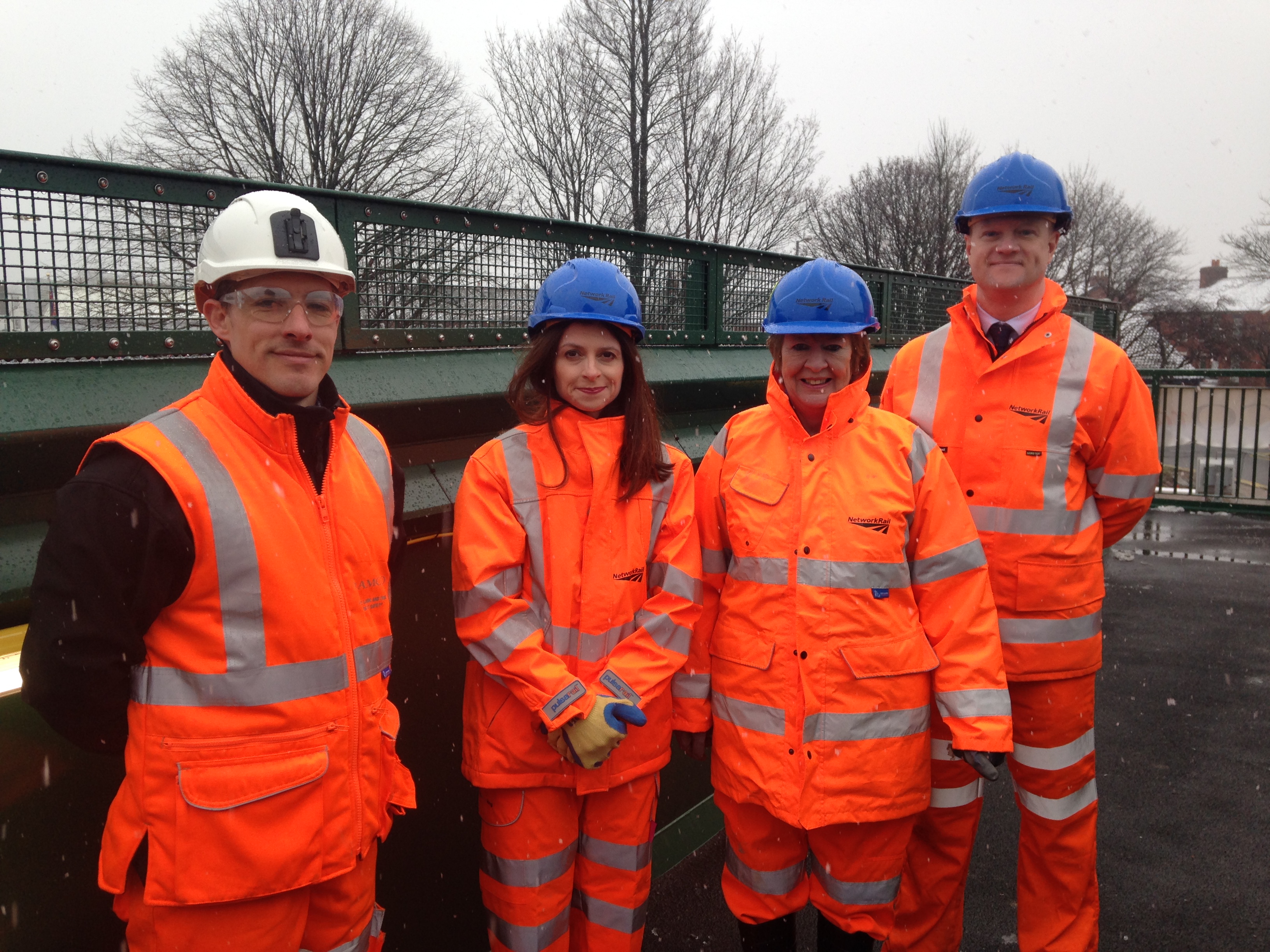 Leyland station fotbridge L-R Network Rail's project manager Sam Burger, Seema Kennedy MP for South Ribble, Cllr Margaret Smith leader of South Ribble Borough Council and Craig Harrop from Northern Rail