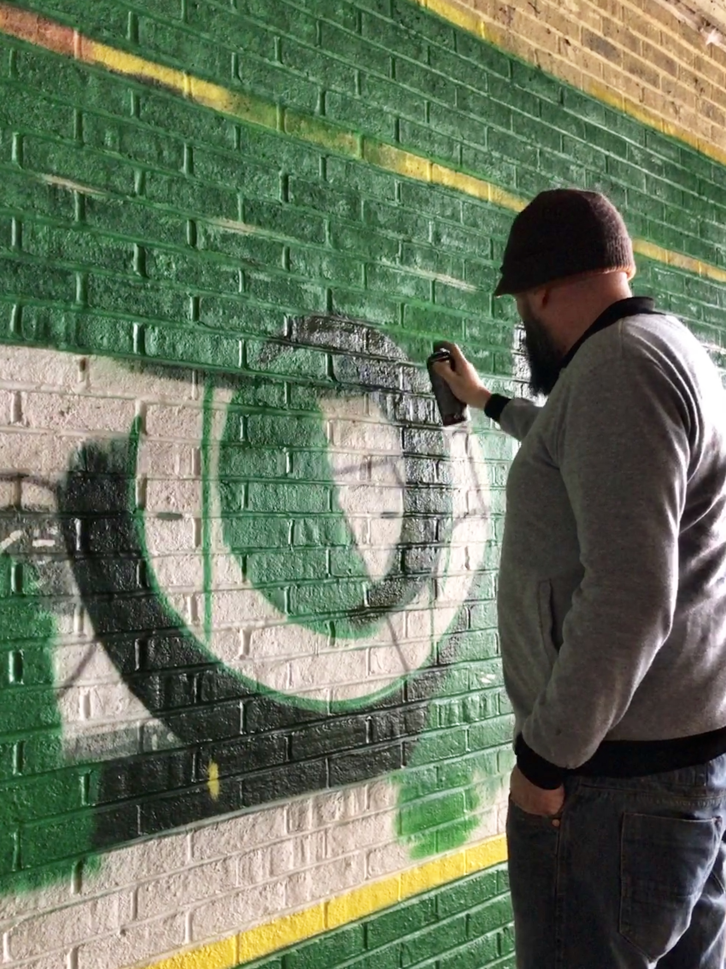 Lionel painting the mural on the passageway In Ashford.