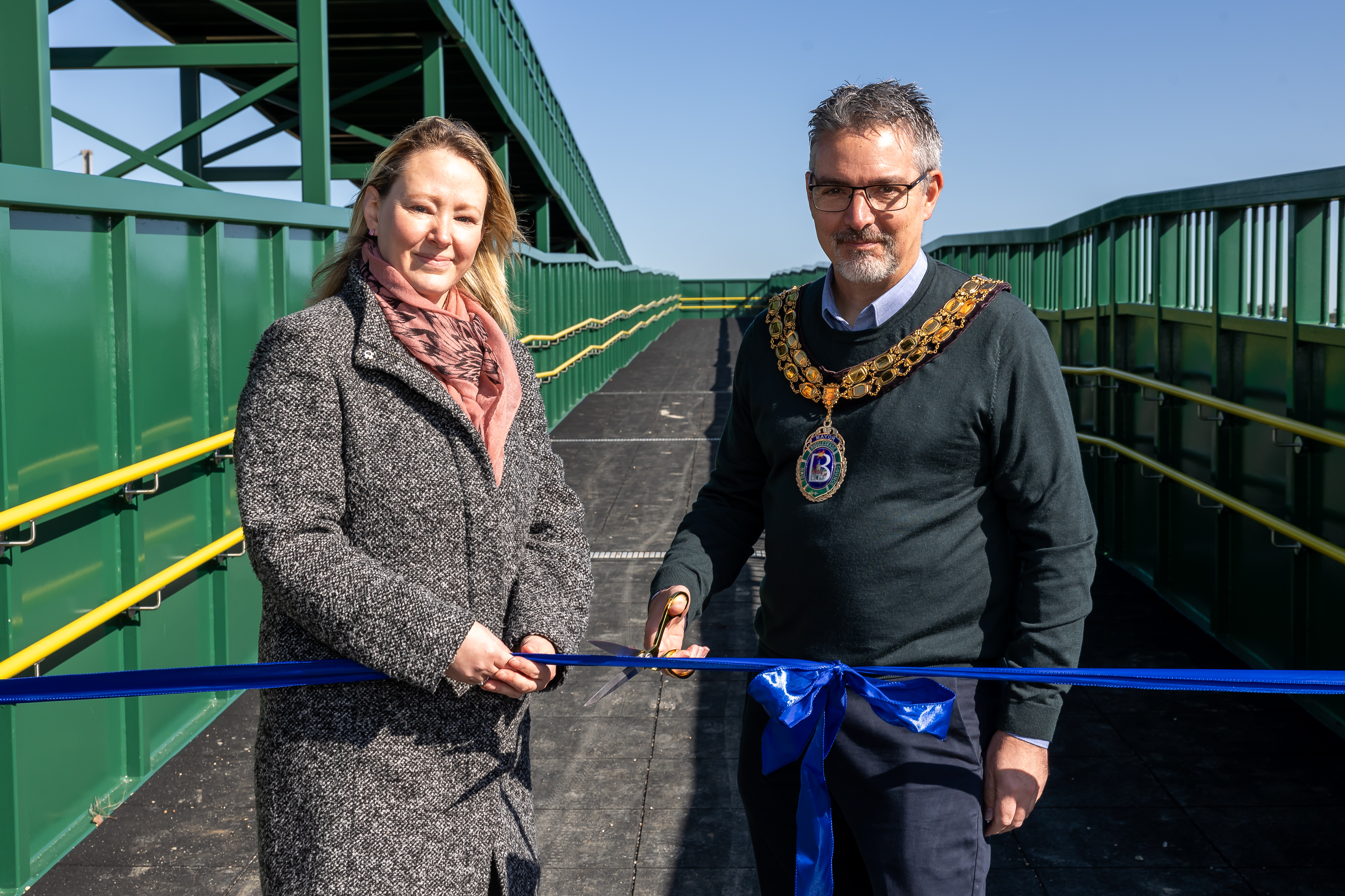 Louise Cox, Network Rail, and Cllr Mark Foster, Mayor of Biggleswade, open Lindsells Bridge