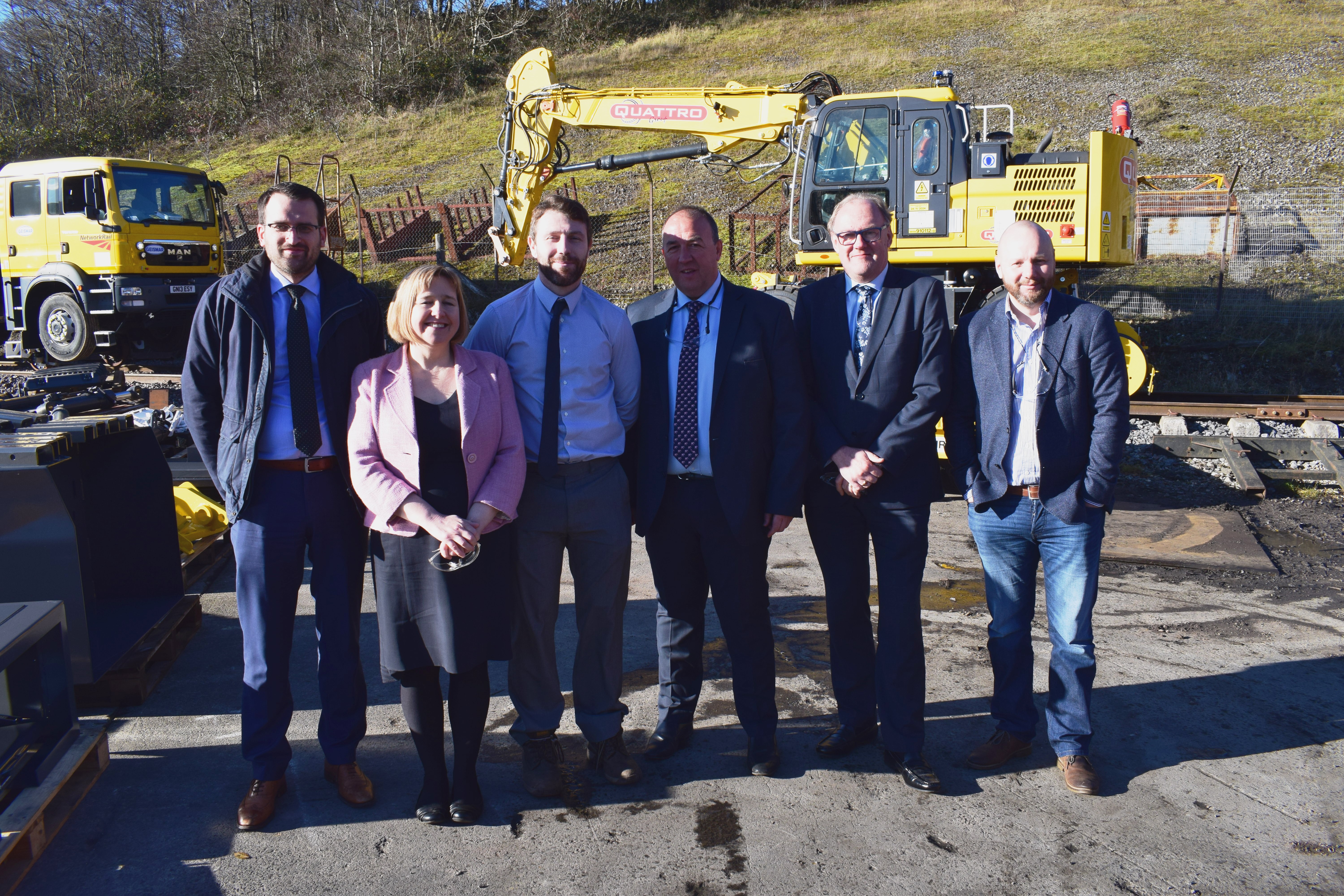 Lynne Neagle AM (second left) with Carl Jones, director of rail engineering, G.O.S (third left) and Wayne Gregory, managing director, G.O.S (third right) and representatives from Network Rail