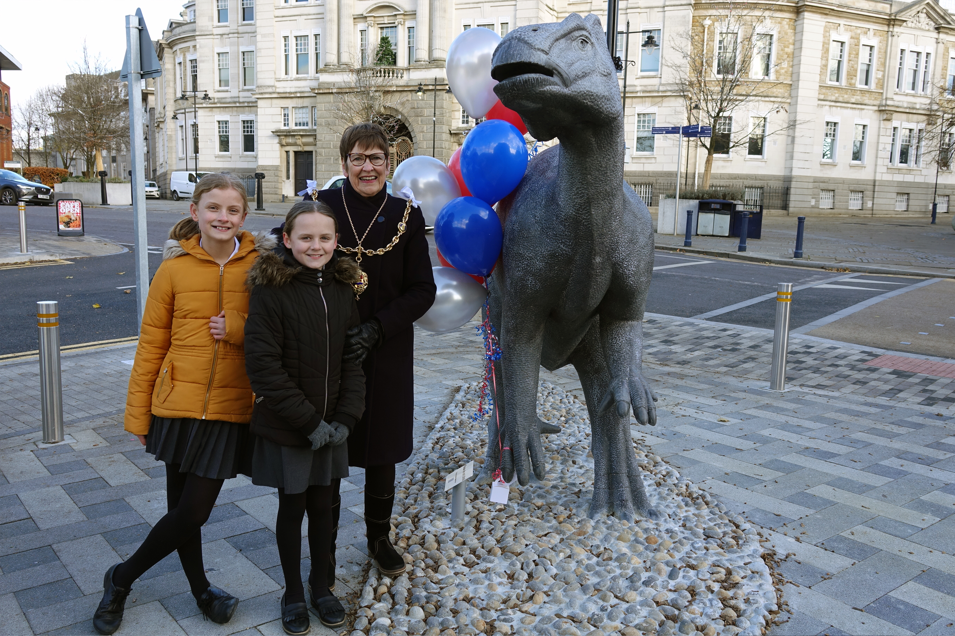 Mayor of Maidstone cllr Faye Gooch with students from Allington Primary School and Iggy the dinosaur