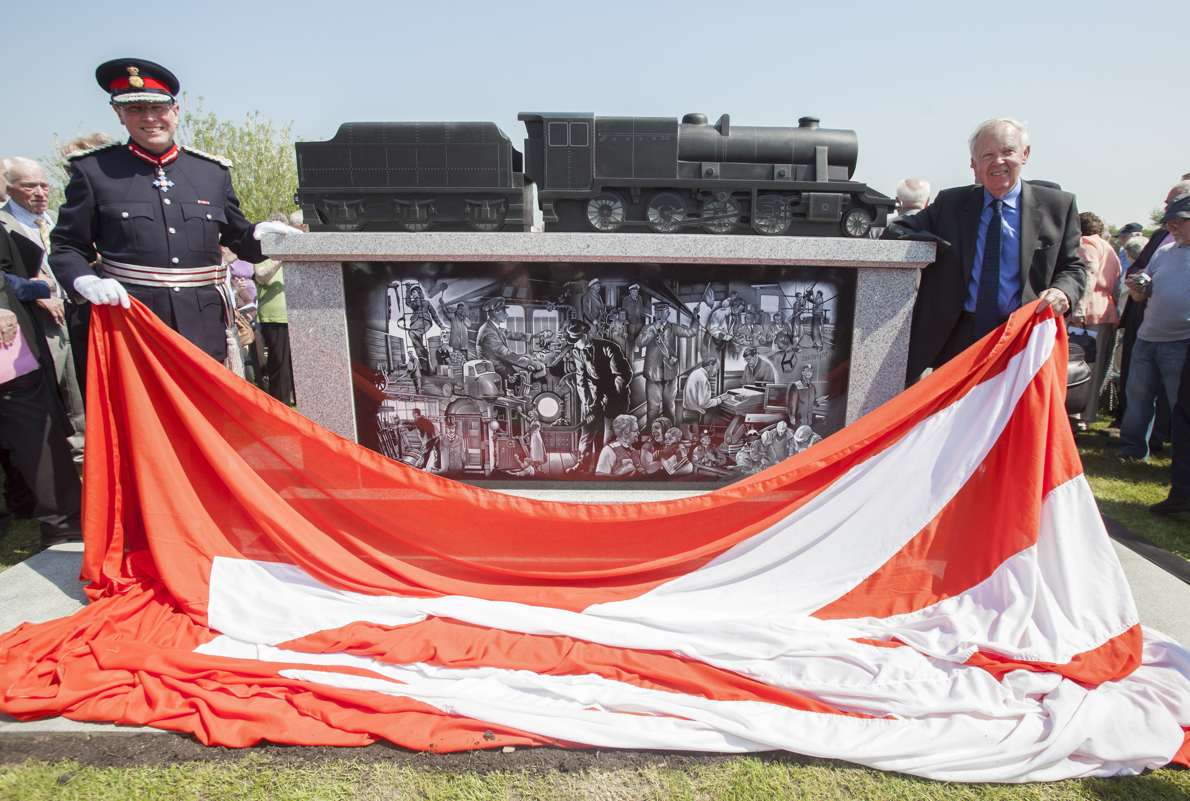 Sir Bob Reid, former chairman of British Rail, accompanied by Ian Dudson, Lord-Lieutenant of Staffordshire, unveil the memorial (22 May 2012).