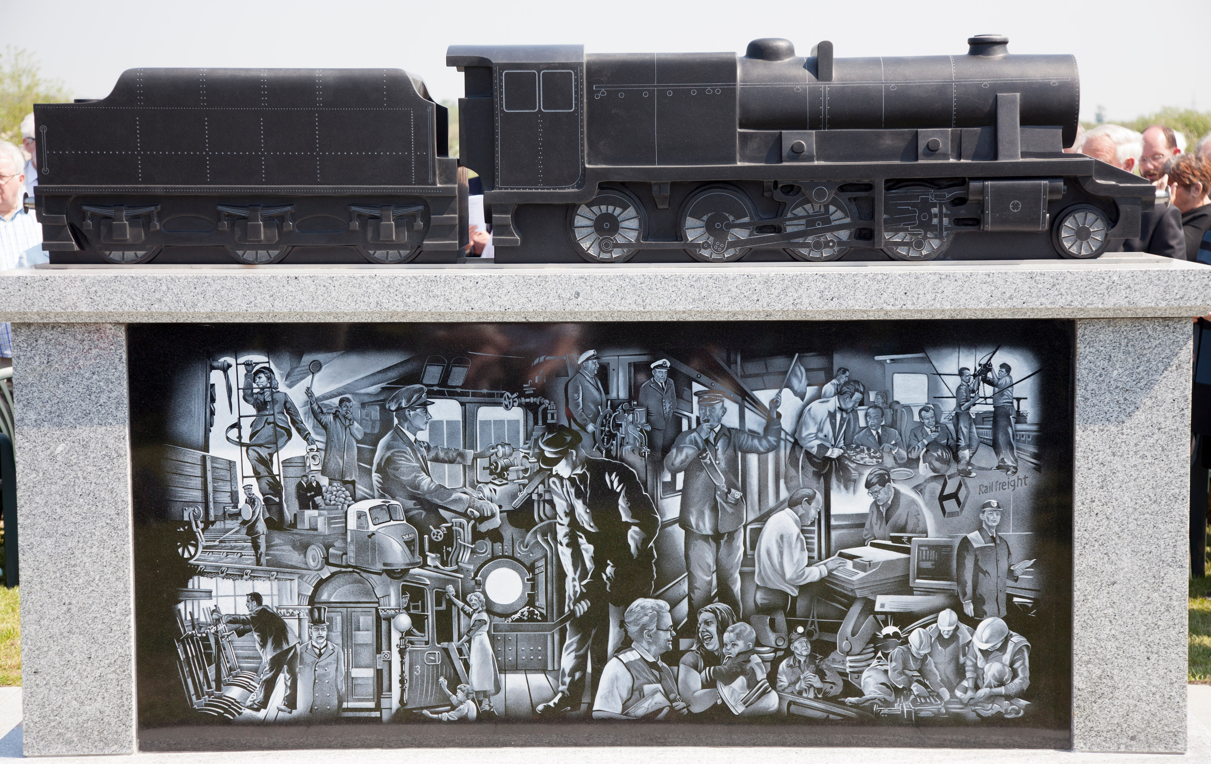 The reverse of the memorial showing the montage of images representing the many aspects of the railways over the decades.