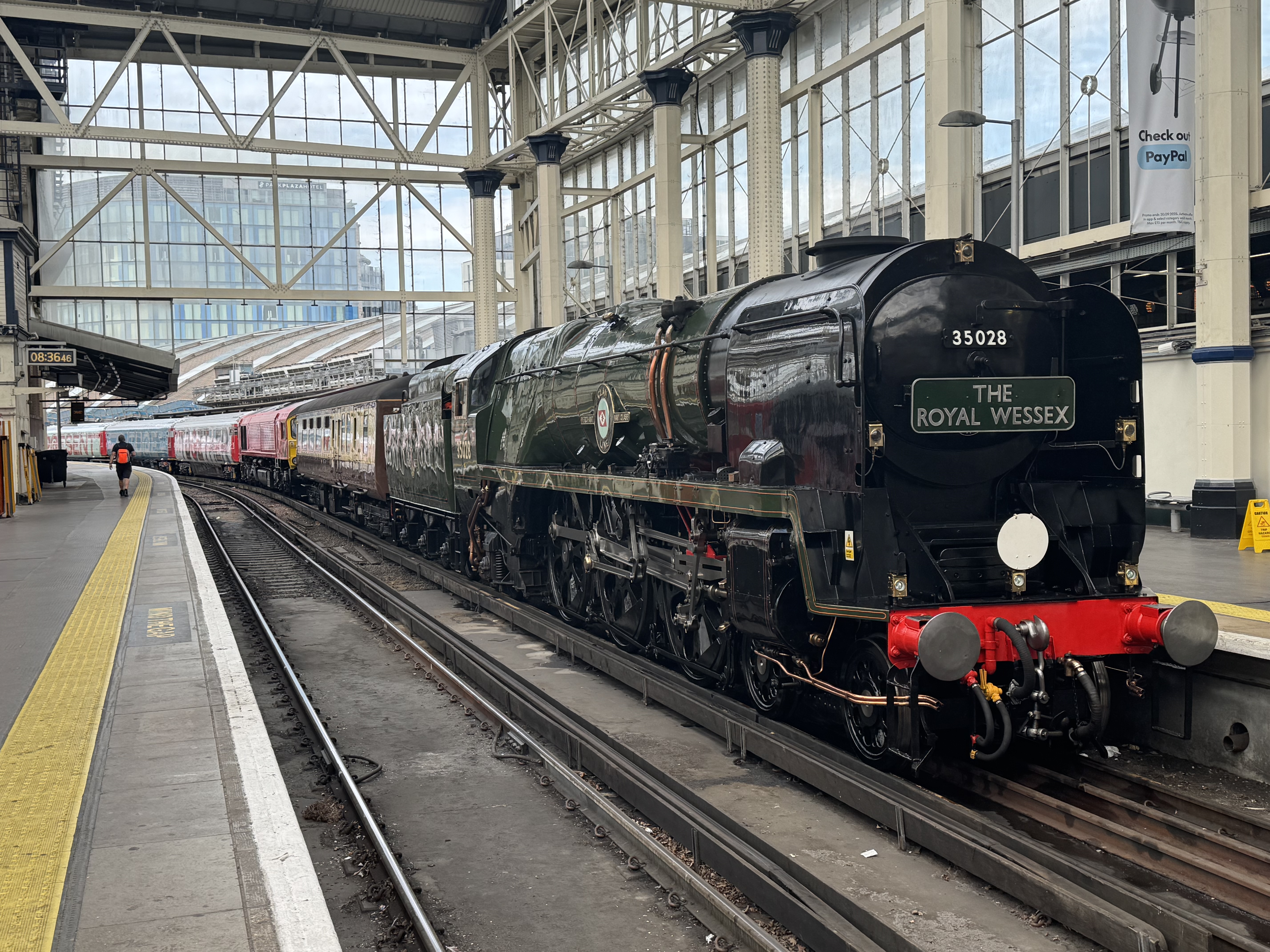 Merchant Navy Class Clan Line No. 35028 was stationed in front of Inspiriation, the Railway 200 Exhibition Train, when it visited London Waterloo in July.jpg