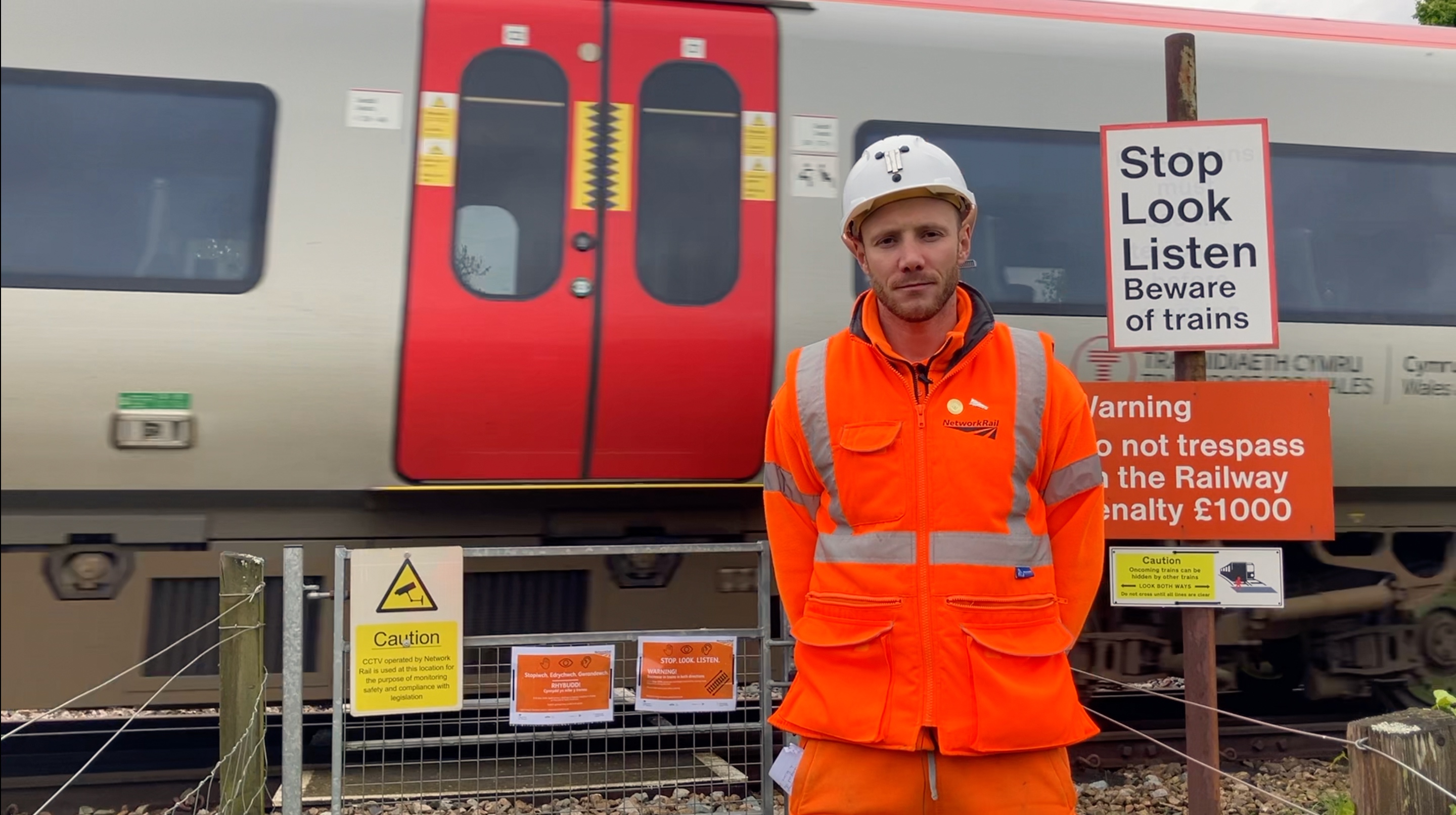 Network Rail level crossing manager Luke Cummings at Lydney Foothpath Level Crossing, May 2024.jpg