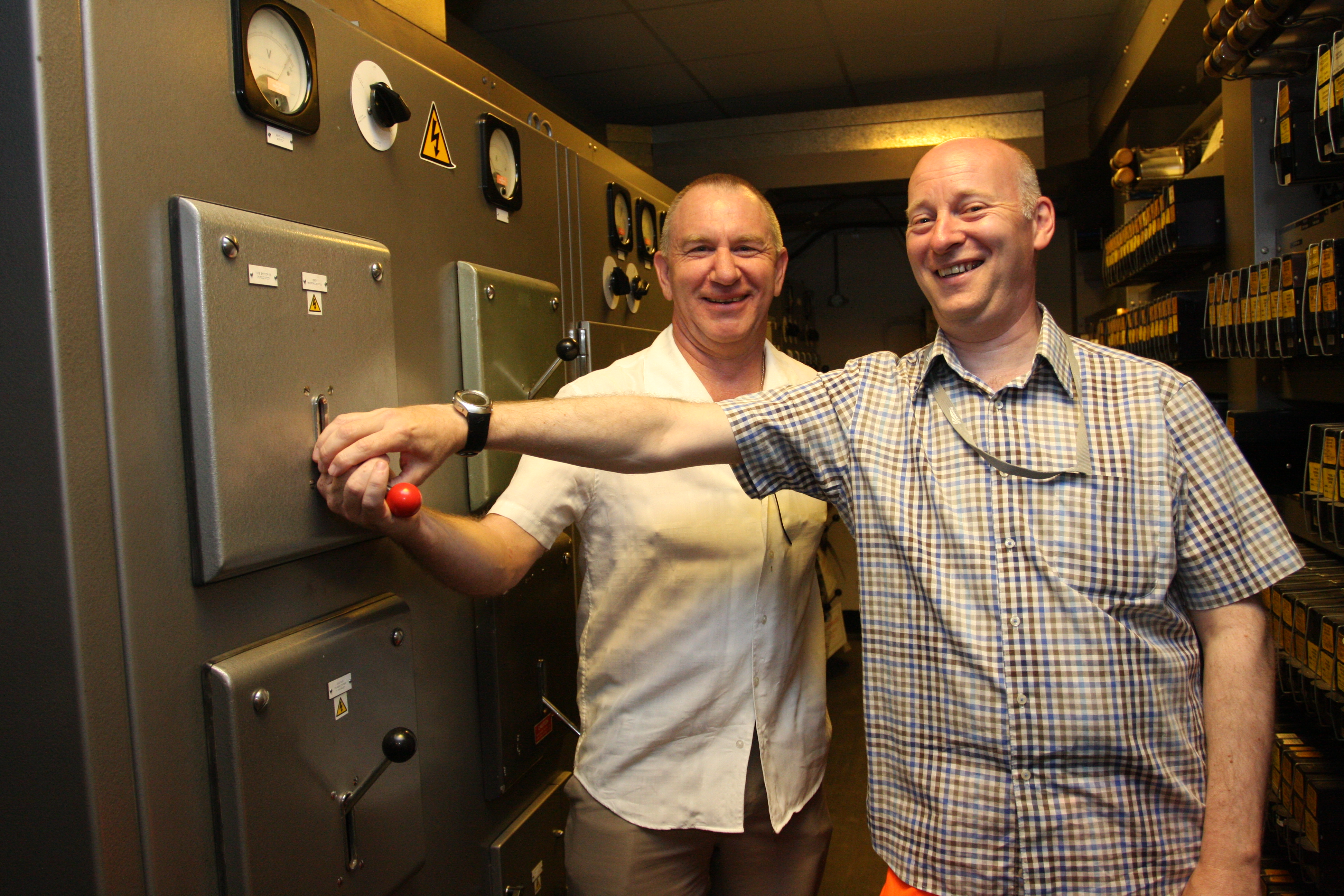Nottingham resignalling: Signals and telecoms engineer Peter Short and resignalling programme manager Dave Scarth pull the lever to switch off the panel and turn off the box.