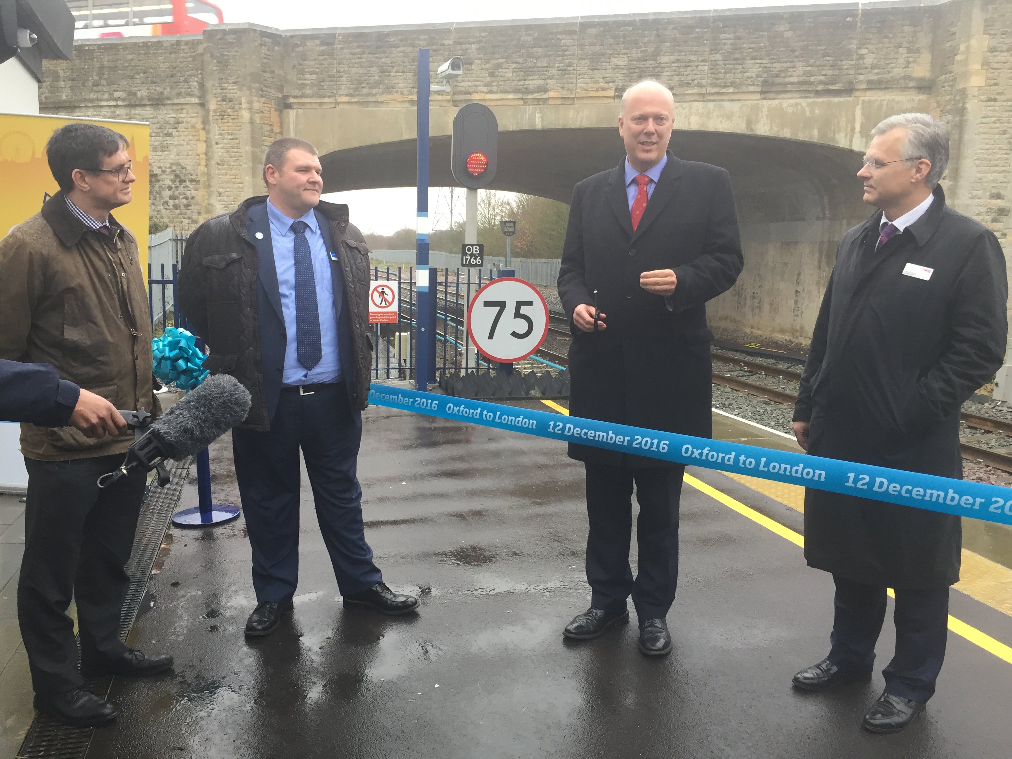 Officially opening the link between Oxford Parkway and Oxford - Martin Frobisher, Network Rail; Dave Penney, Chiltern Railways; Chris Grayling, secretary of state; Mark Carne, Network Rail