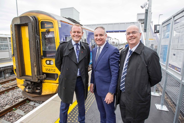 Alex Hynes (L) is joined by Richard Lochhead MSP and Roy Brannen of Transport Scotland at the opening of Forres station