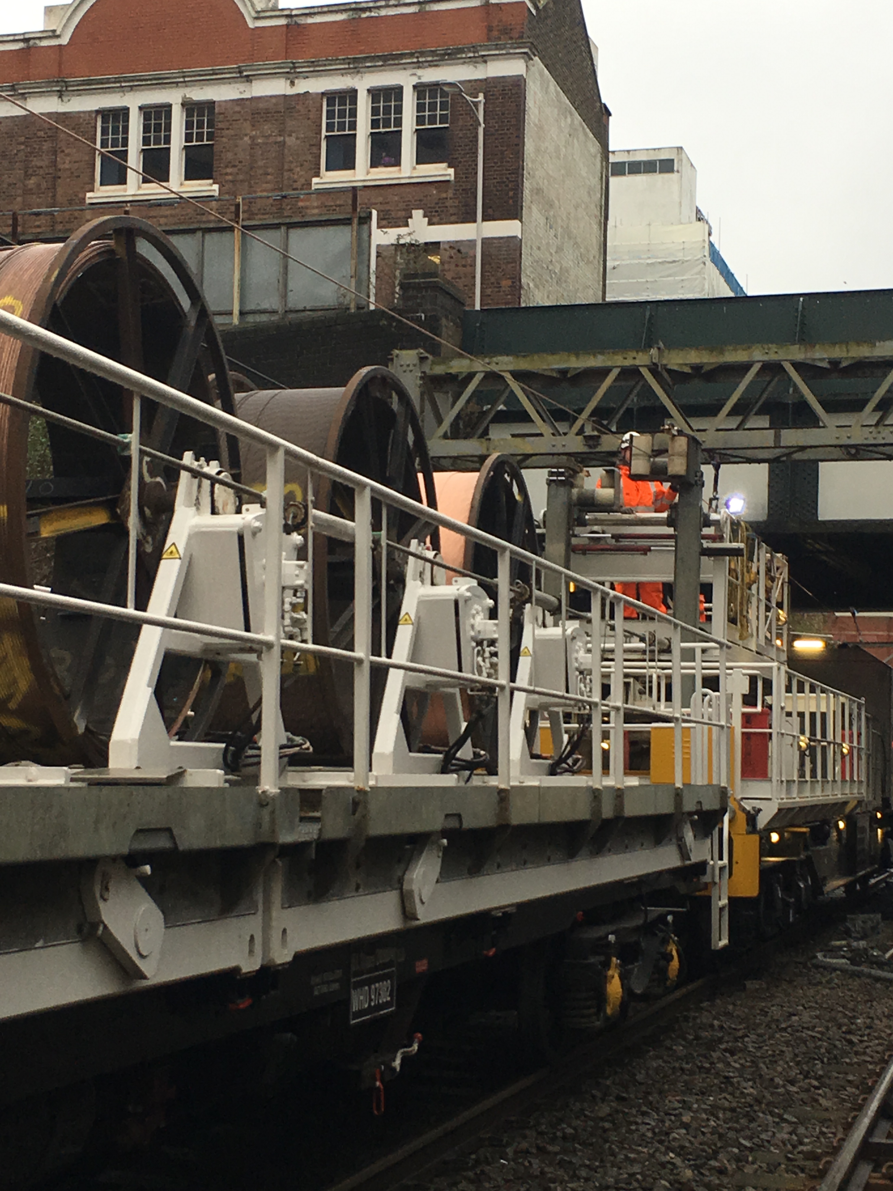 Overhead wiring train at Ilford