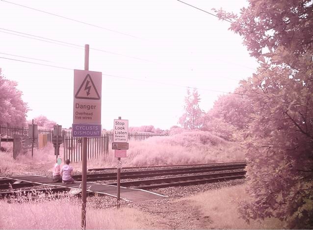 Pedestrians sitting on level crossing in Doncaster.jpg