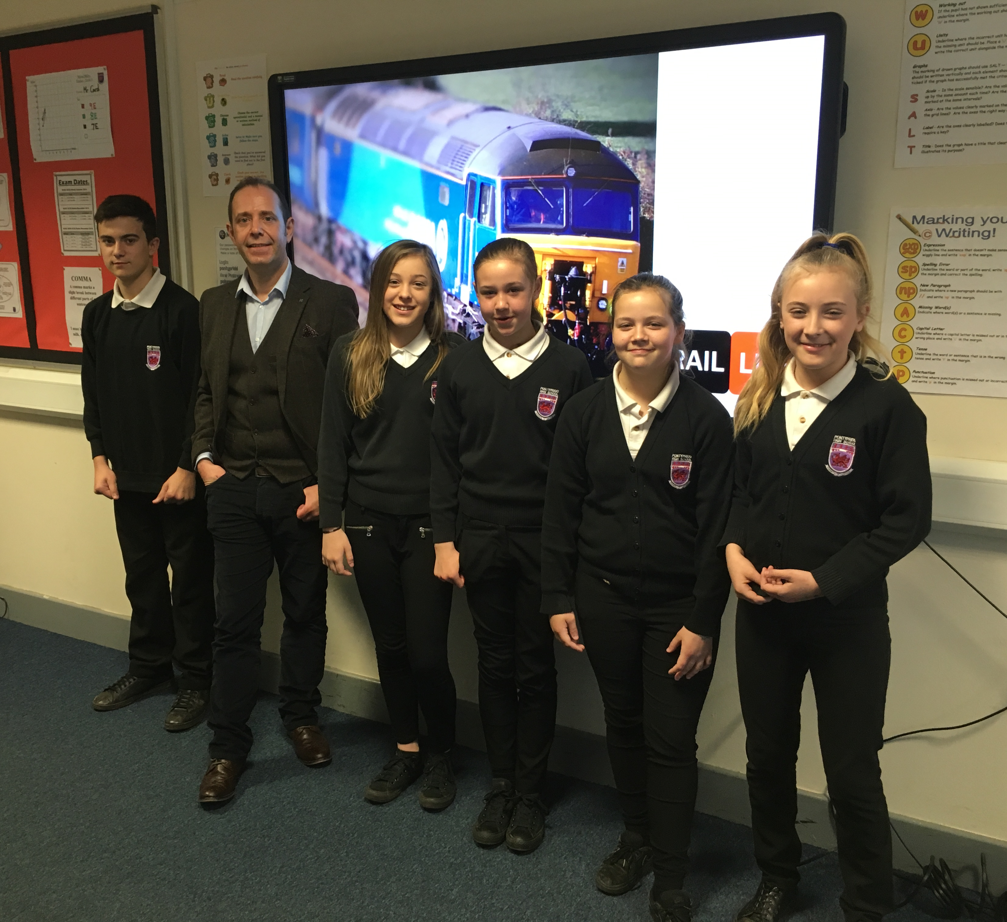 Crucial Crew: Network Rail education provider Pete Walsh (second from left) is pictured with Pontypridd High School pupils (pictured from left to right); Bradley Spear, Francesca Penny, Nadia Cummings, Chloe Gwynne and Isabell Dyer.