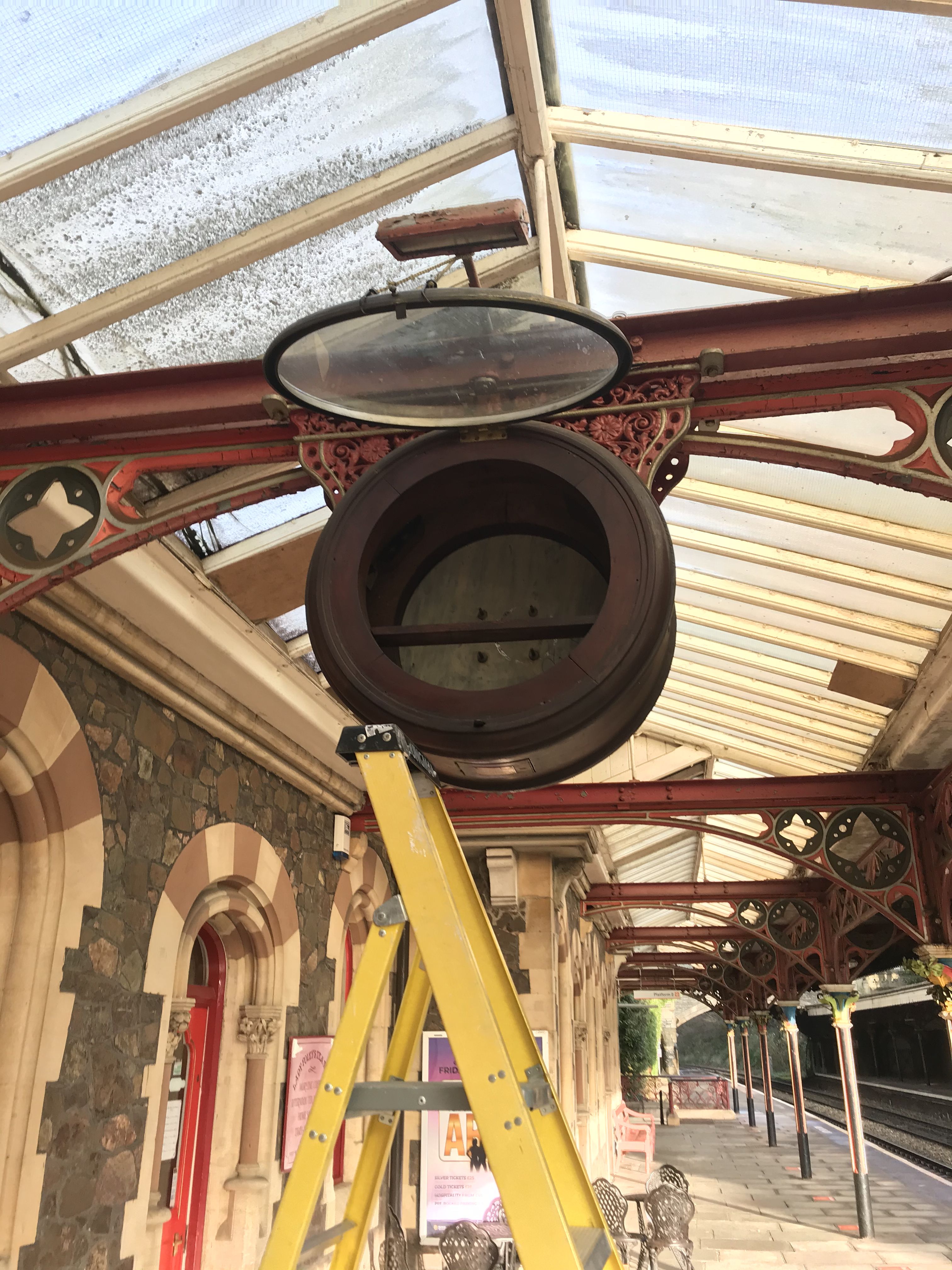 Empty clock casing on platform 1 at Great Malvern station - credit Smith of Derby