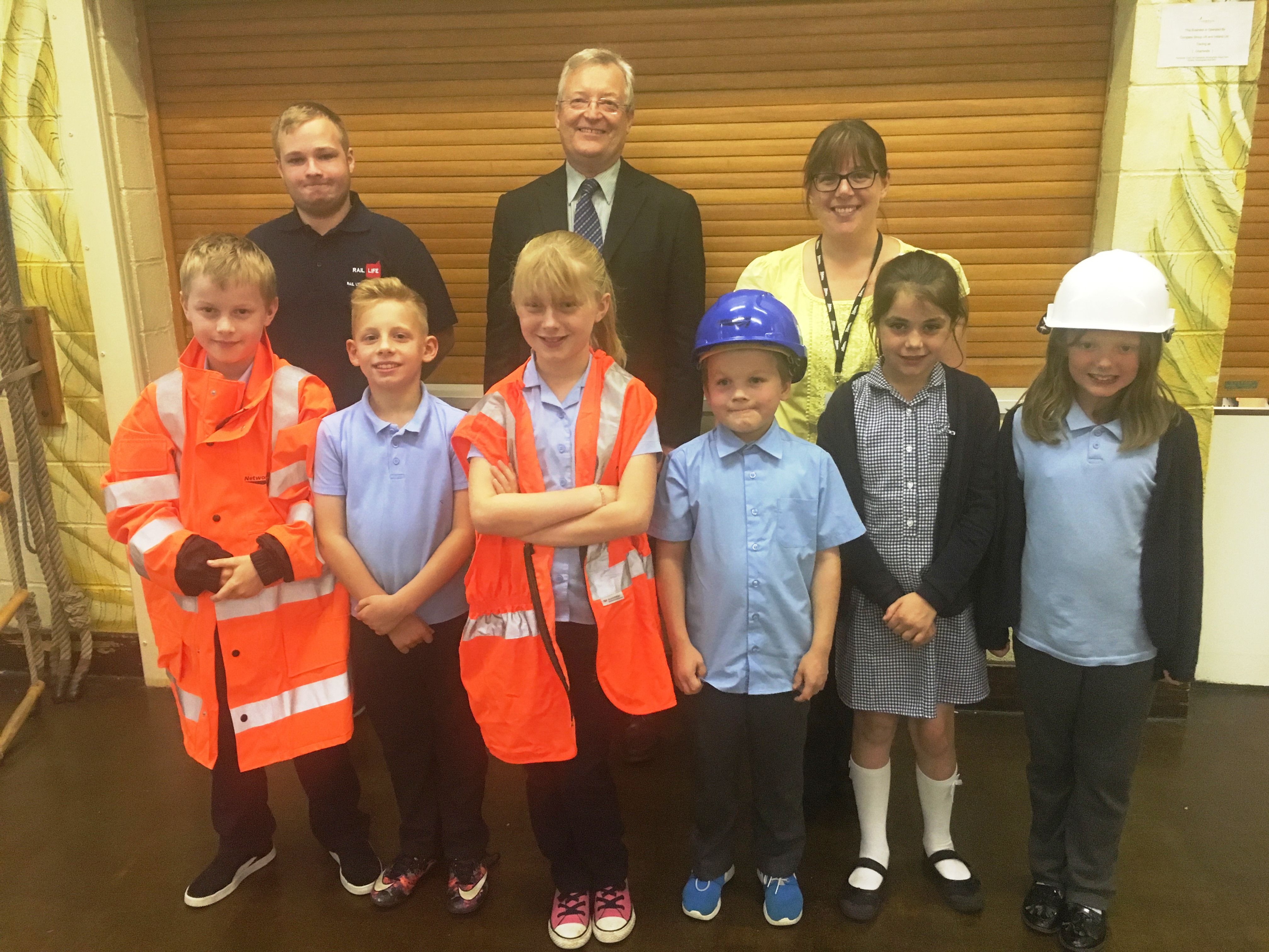 Dan Partridge, Rail Life Ambassador, Charles Varey, lead programme development manager and Tracey Young, community safety manager, with pupils from Duffryn Junior School, Newport, during the first ever Rail Week