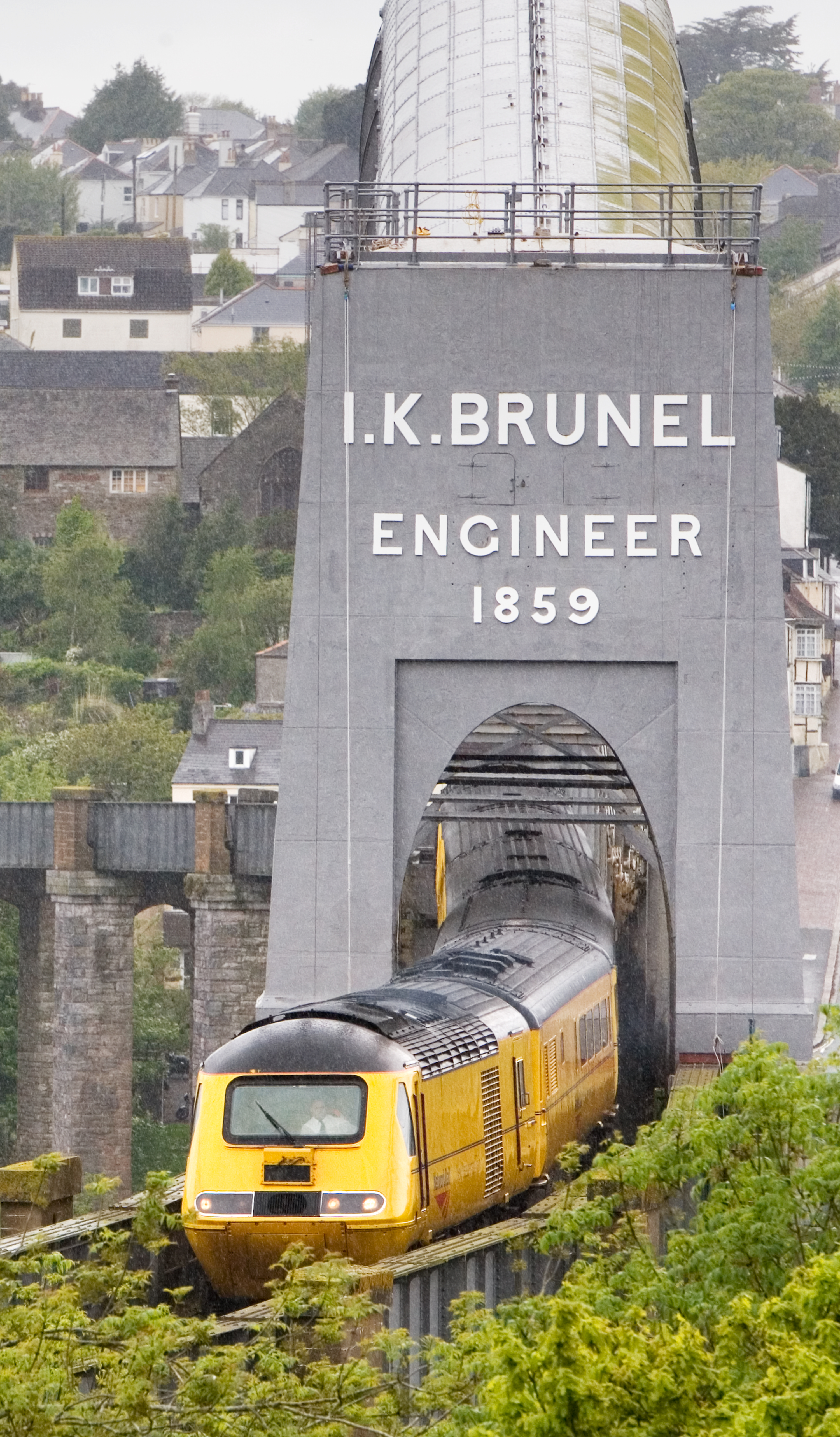 Portrait shot of Isambard Brunel's Royal Albert Bridge with Network Rail New Measurement Train passing through it.