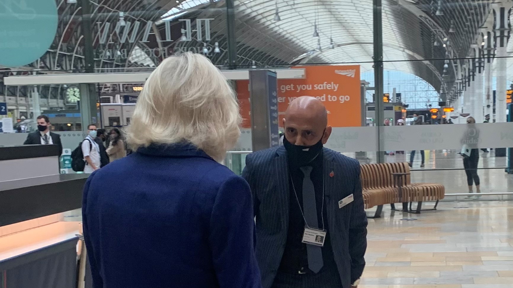 Network Rail's Paddington station manager Haji Mustaq with the Duchess of Cornwall
