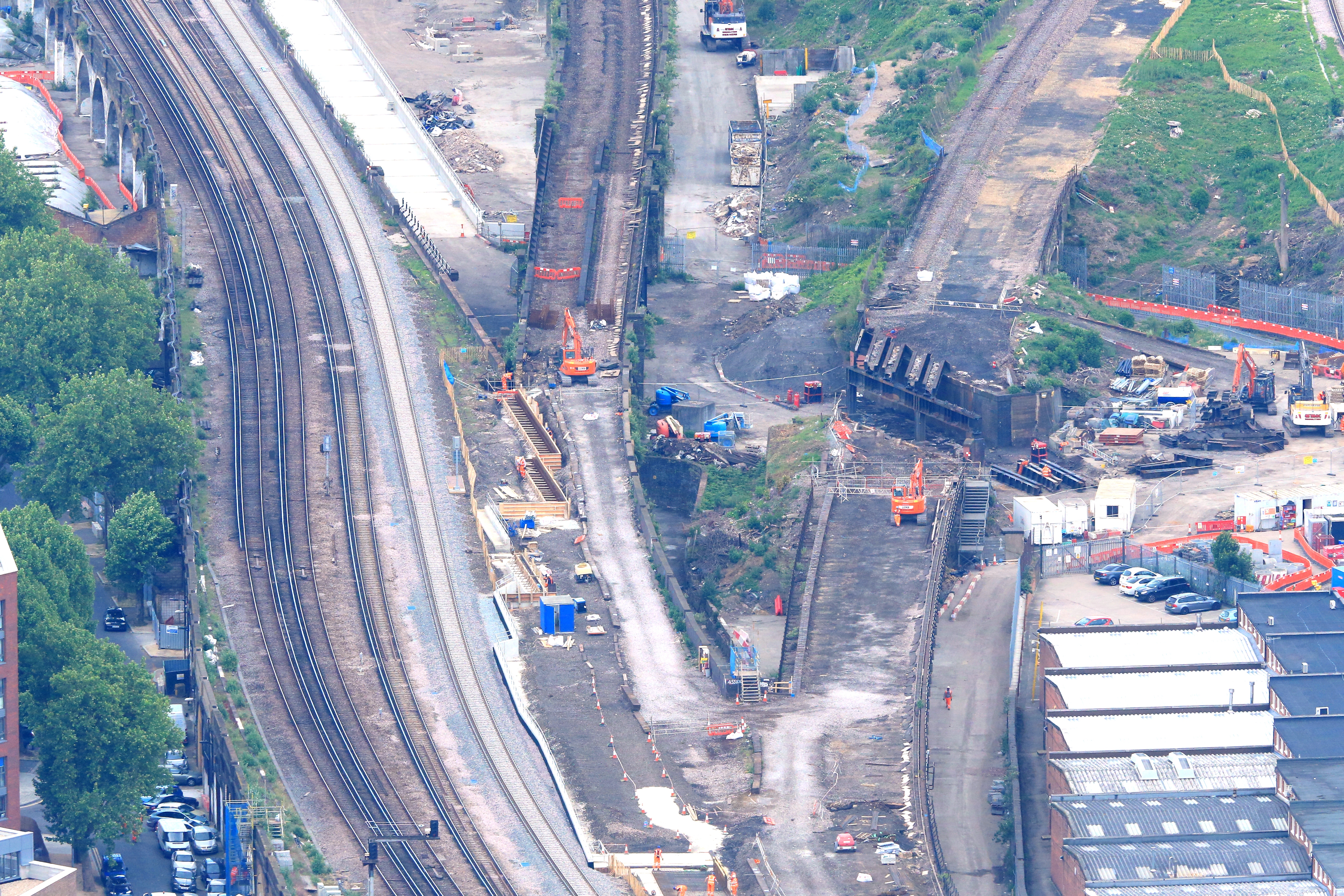 Demolition begins at Bermondsey. When complete, Charing Cross trains will arrive at top left, dive down, and run on a new railway diagonally top left to bottom right of the picture. Thameslink trains will arrive at top right, and pass over the Charing Cross lines as they head towards the centre- bottom of the picture. Both existing (and now disused) viaducts, middle and right, will be partly demolished.