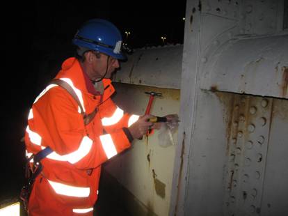Expert taking samples from bridge to analyse paint system