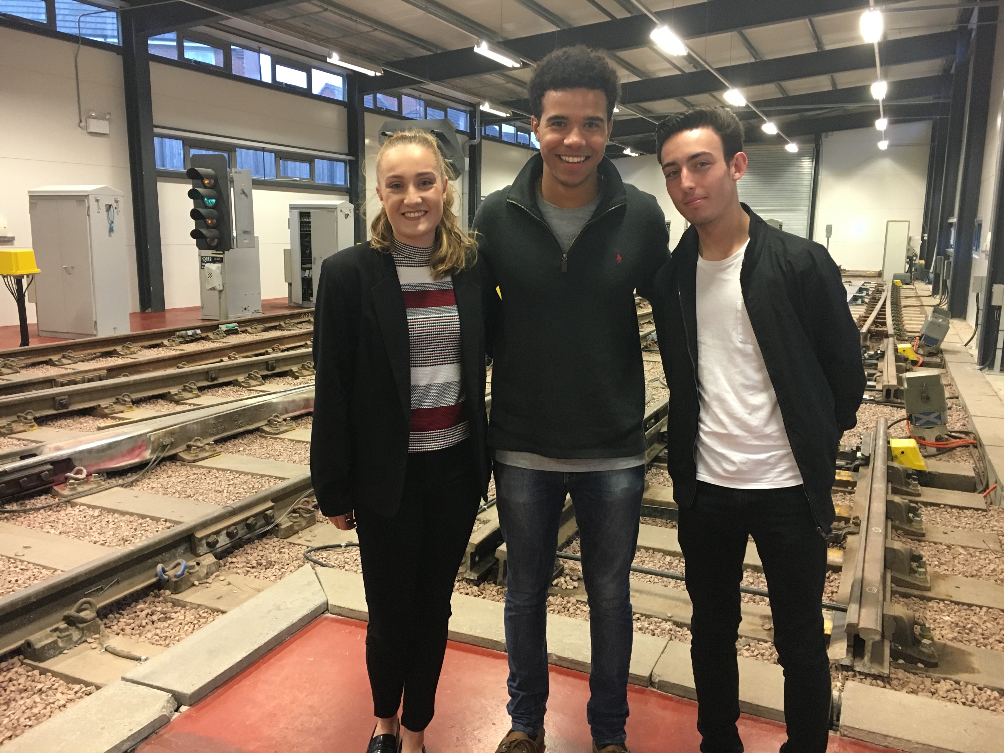 New apprentices Rachelle McQueen, Christopher Donaldson-Rolle and Jordan Hughes take a tour of Network Rail's Larbert training centre