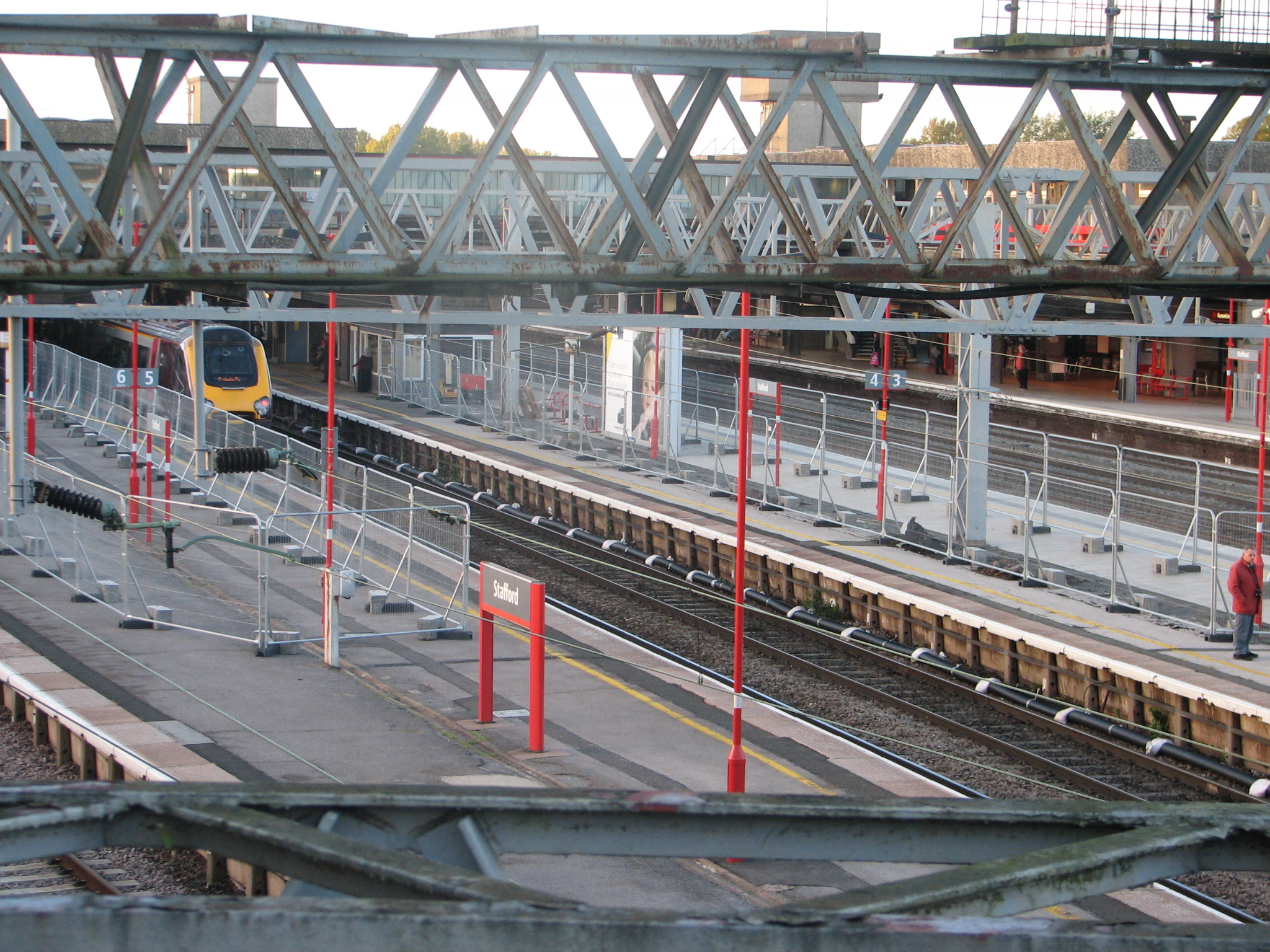 Fencing on the platforms at the Wolverhampton end of Stafford station shows where work has started on a £3m refurbishment project (Oct 2012)