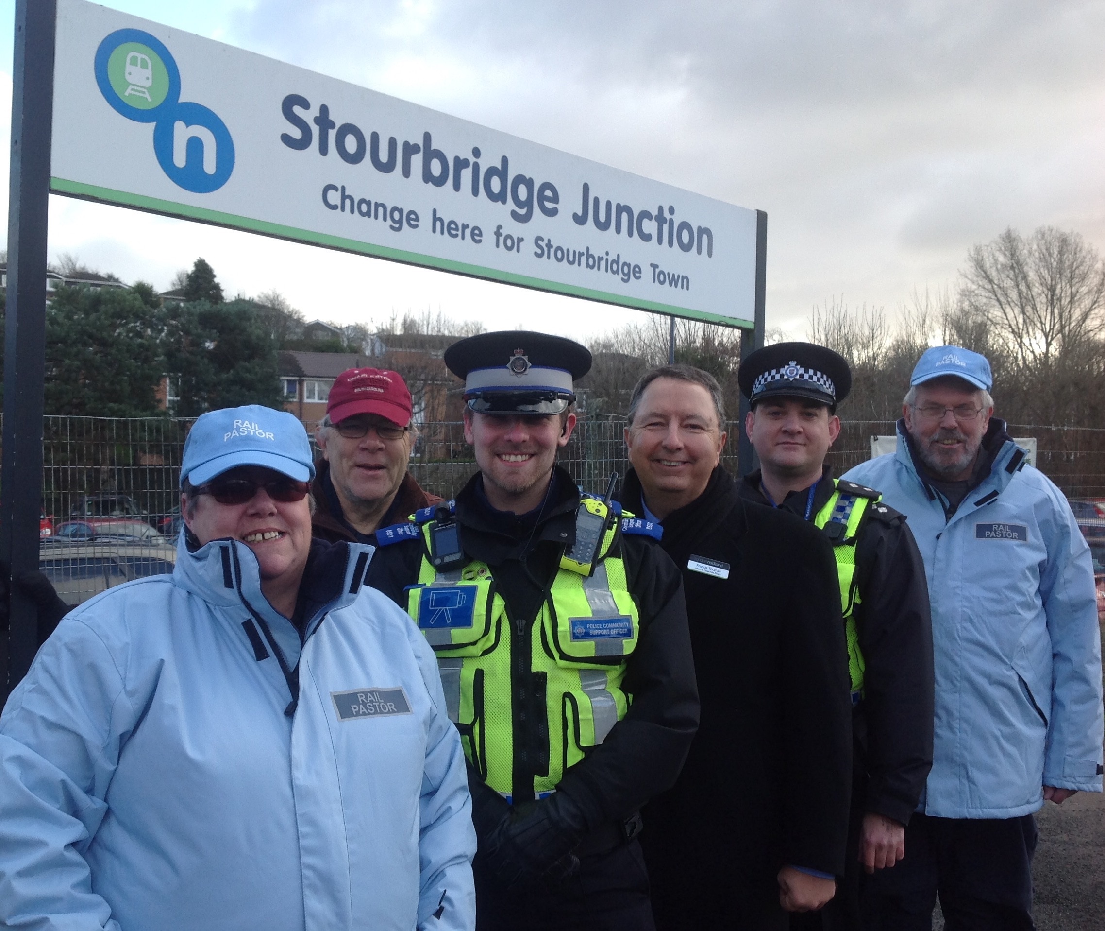 From l to r: Rail Pastor Alison Underwood, Stourbridge Street Pastor Chair David Watts, PCSO Aaron Tiso, London Midland Head of Corporate Affairs Francis Thomas, Inspector Dave Rams, Rail Pastor Steve Underwood.