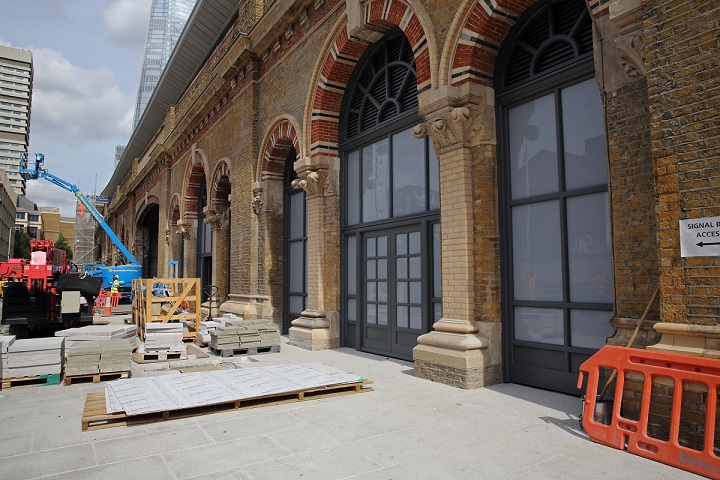 Paving slabs are laid outside the new façade on St. Thomas Street.