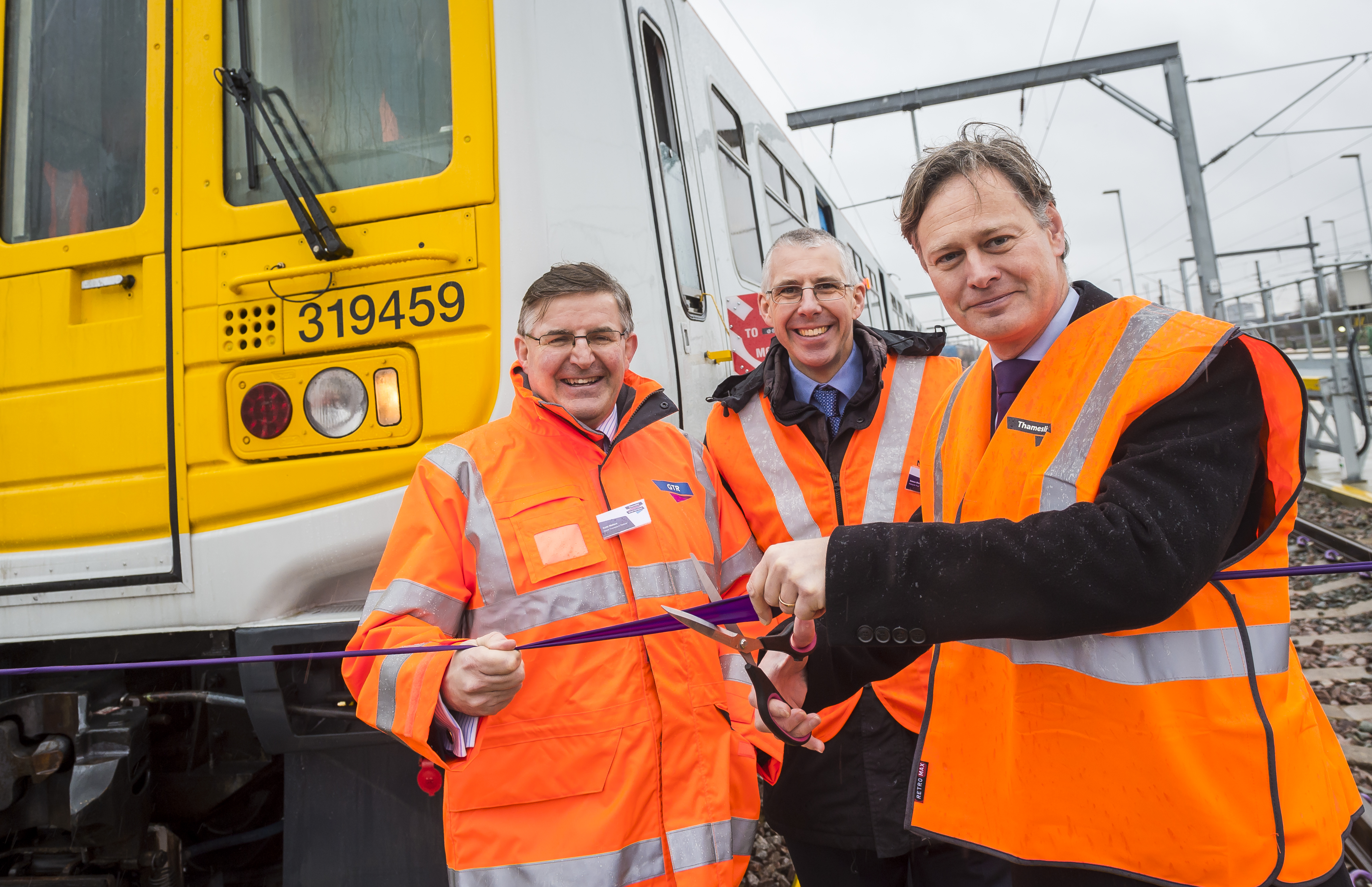 Keith Wallace from GTR, Simon Blanchflower from the Thameslink Programme, and Matthew Offord MP cut the ribbon to open the sidings