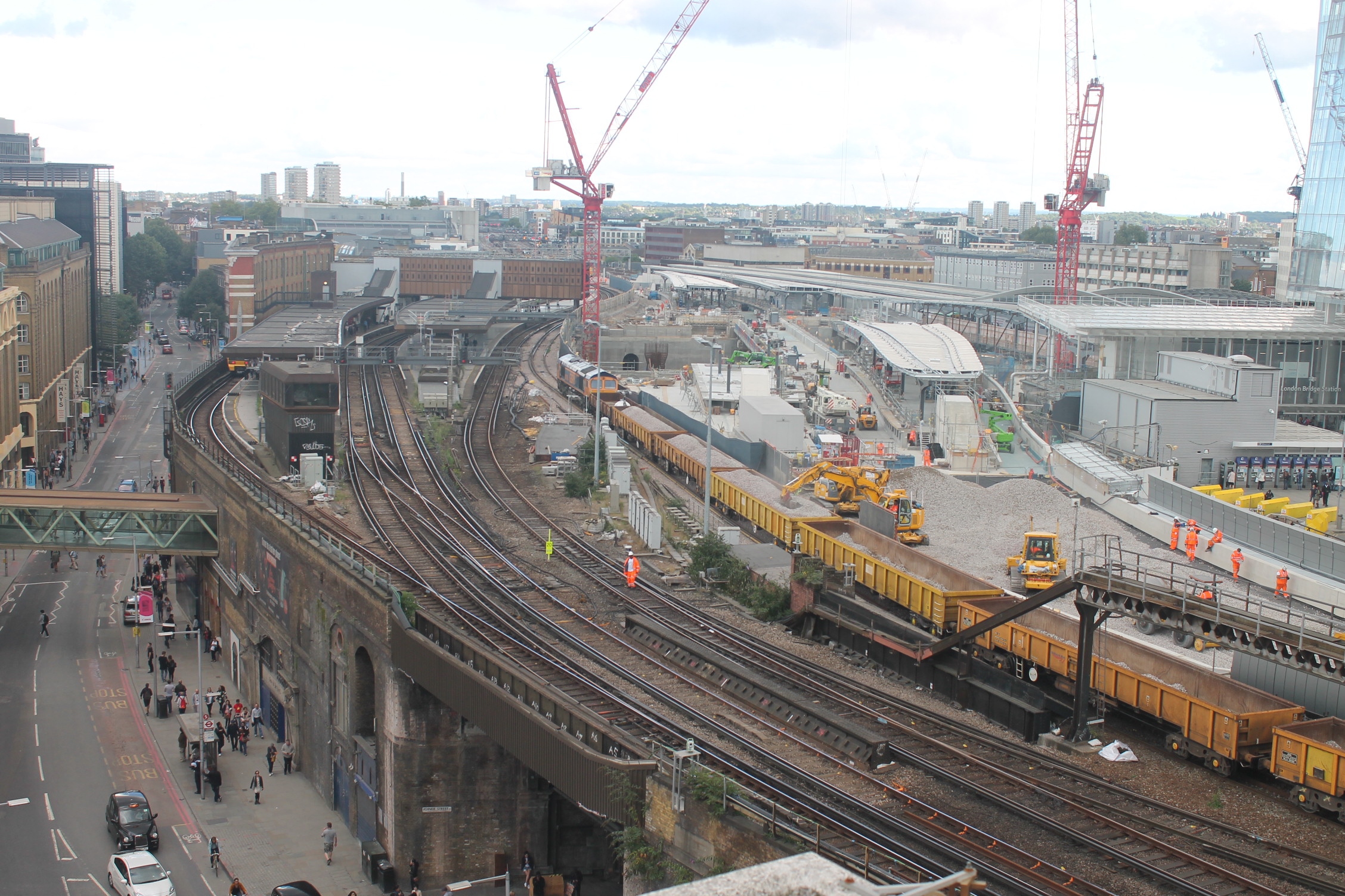 The first ballast is delivered and laid on the approach to the new Borough Market viaduct this Saturday (September 12). London Bridge platforms 6,7, 8 and 9 grow in the background