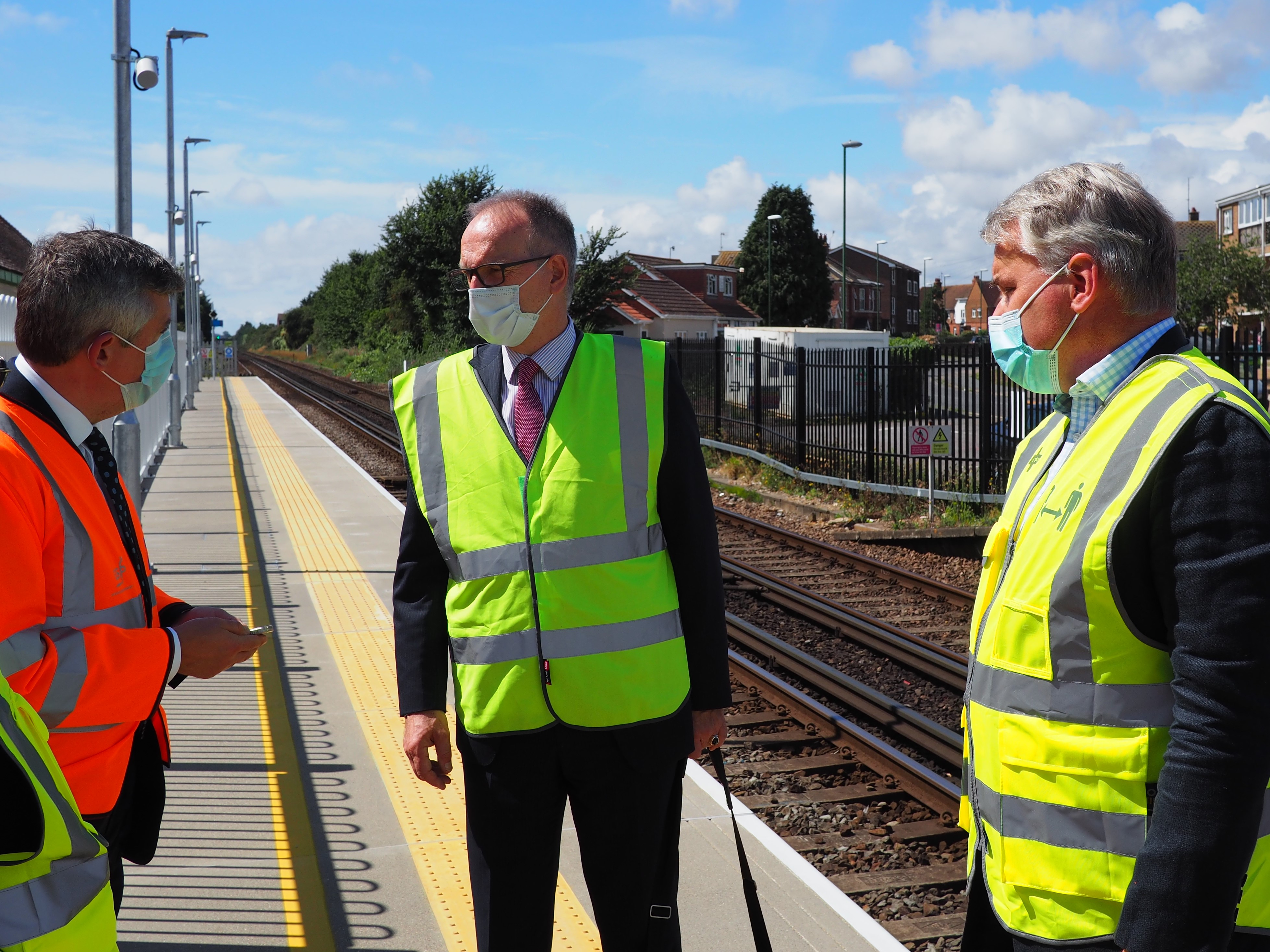 MP Tim Loughton visits Lancing station to see the new platform extension (visible in the background)