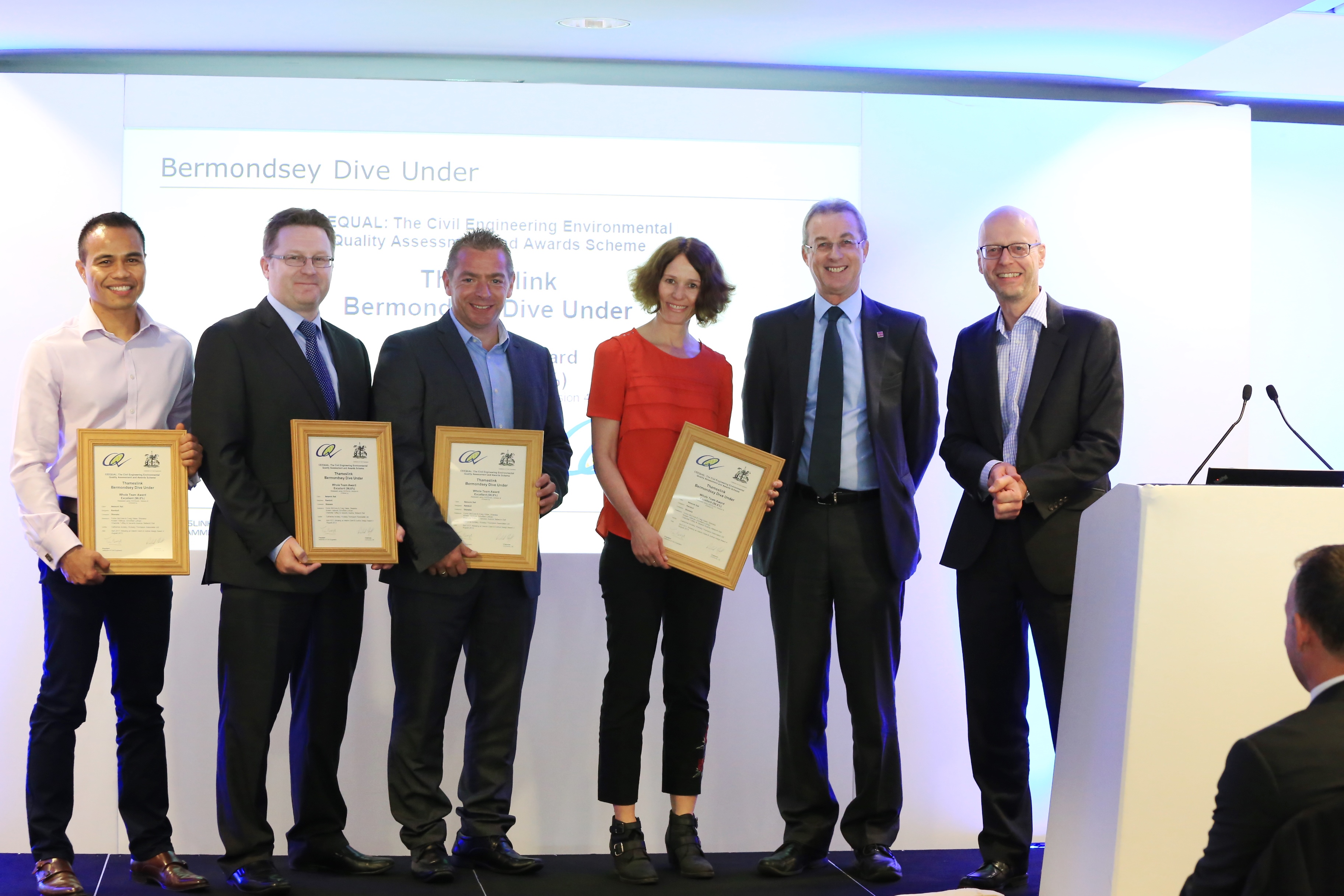 L-R Gerardo Austria (Network Rail), Charl de Kock (Skanska), Kevin Sullivan (Network Rail), Kirsten Velthius (Network Rail), Chris Broadbent (CEEQUAL and BREEAM Infrastructure), Nick Gray (Network Rail) accept the CEEQUAL award at The Oval