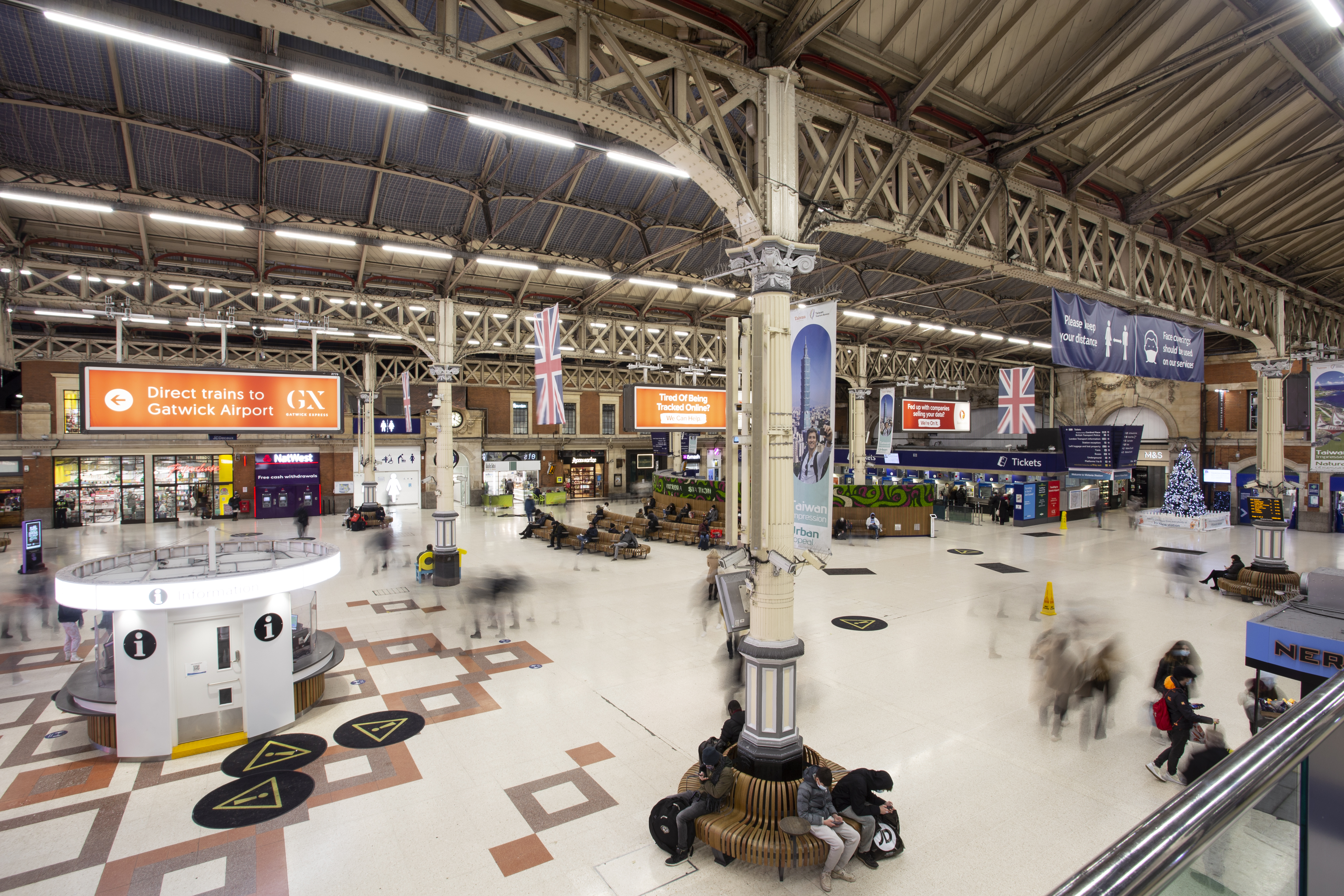 London Victoria central side concourse, built by the London Brighton and South Coast railway with a ridge and furrow roof, with trains to the south coast, including Brighton, Eastbourne Gatwick Airport and Croydon