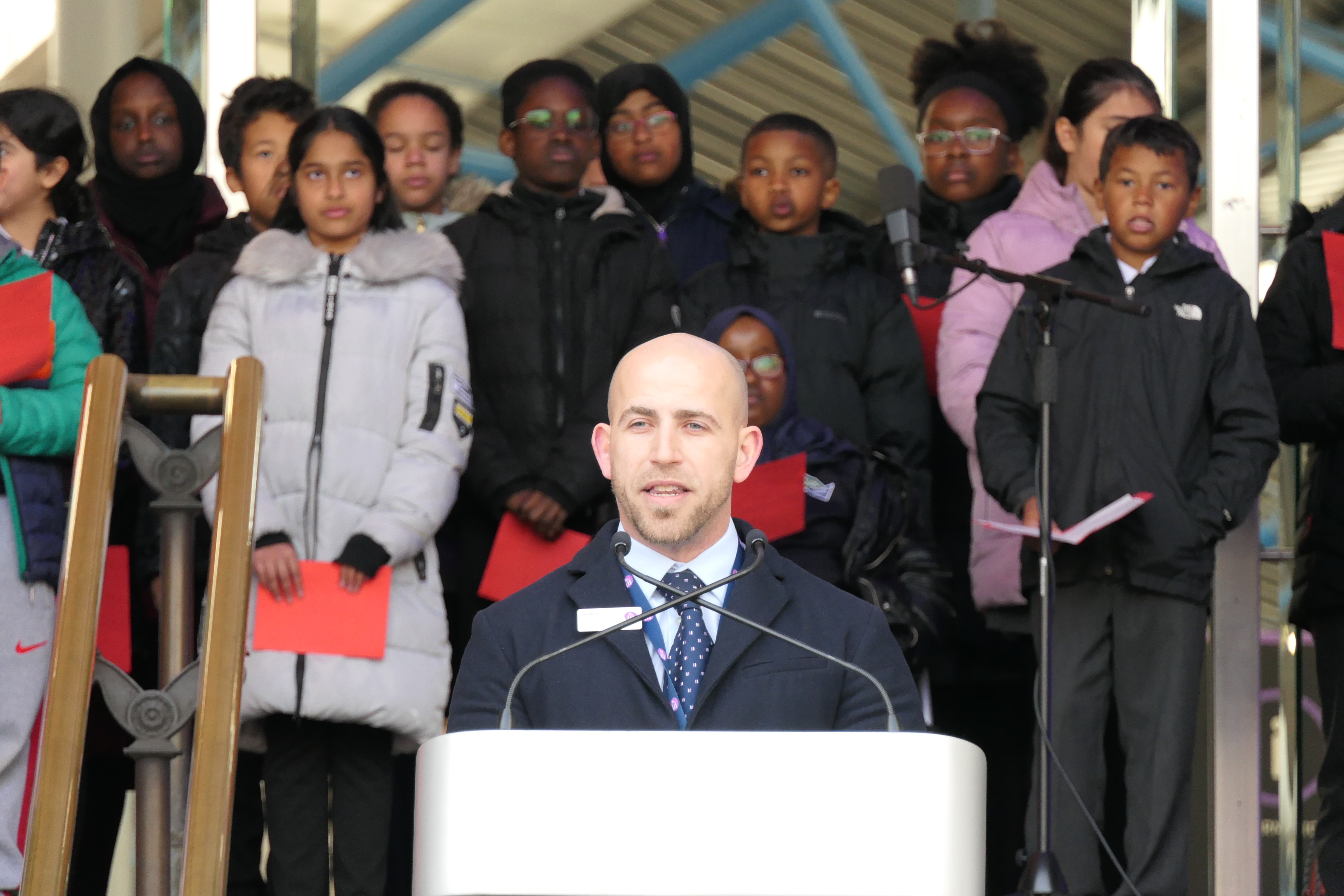 Waterloo station manager Cem Davis at the rededication of Victory Arch, London Waterloo