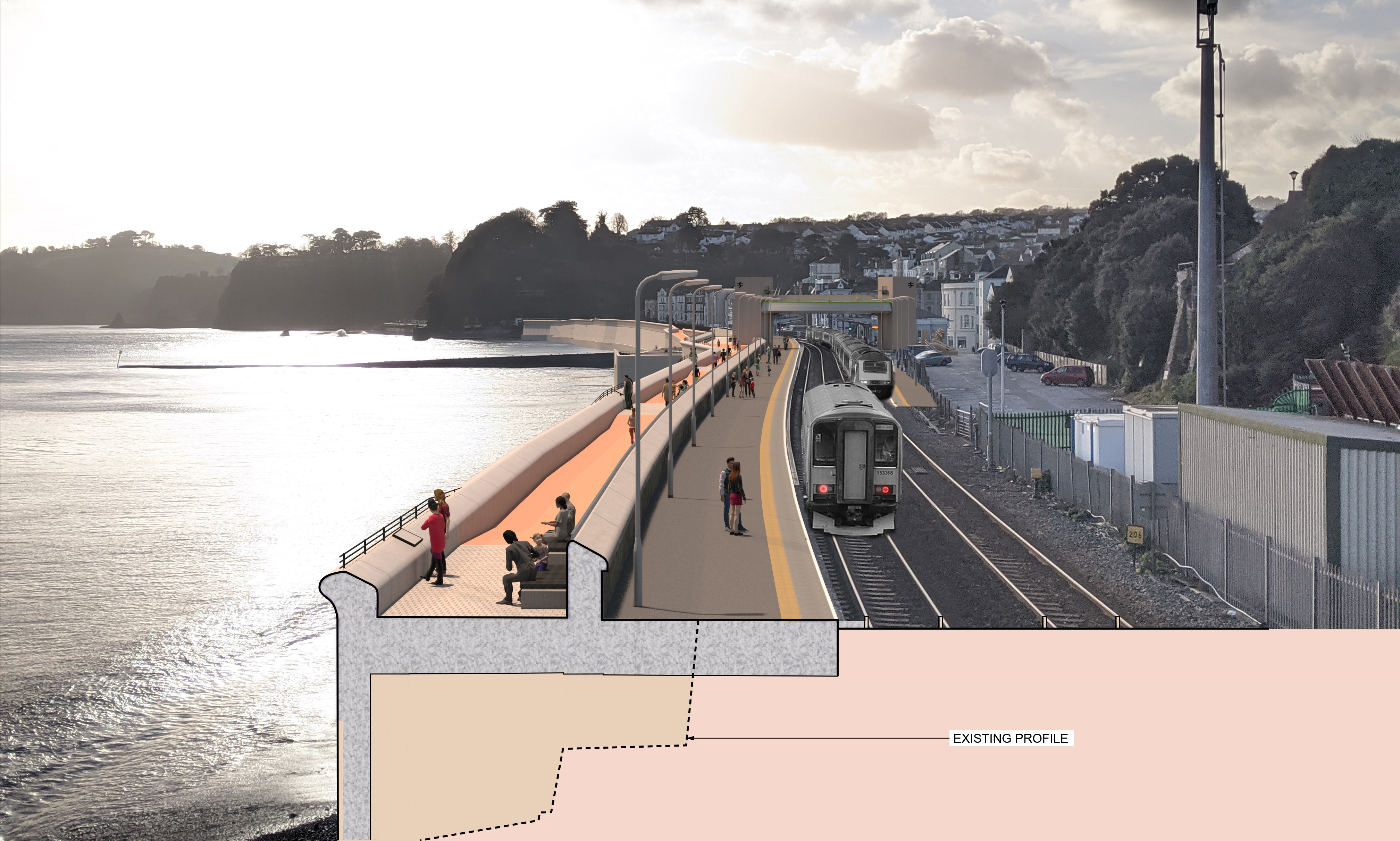 View of new promenade towards Dawlish station with train