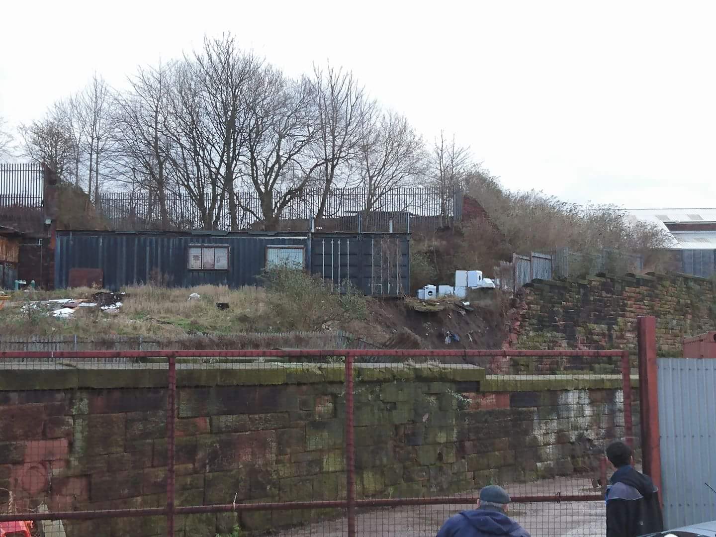 View of the damage to the reatining wall between Liverpool Lime Street and edge Hill from the opposite side of the railway line
