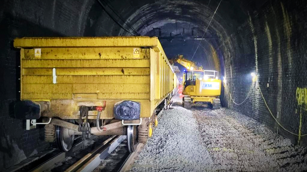 Wagon inside Beechwood Tunnel during October 2022 track replacement